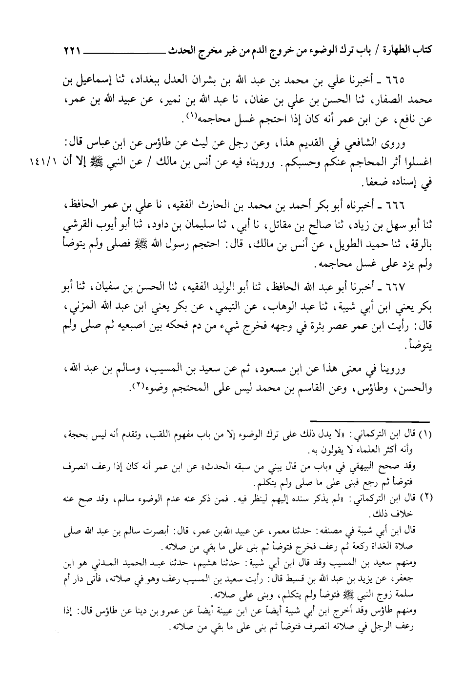 667 - أَخْبَرَنَا أَبُو عَبْدِ اللهِ الْحَافِظُ، ثنا أَبُو الْوَلِيدِ الْفَقِيهُ، ثنا الْحَسَنُ بْنُ سُفْيَانَ، ثنا أَبُو بَكْرٍ يَعْنِي ابْنَ أَبِي شَيْبَةَ، ثنا عَبْدُ الْوَهَّابِ، عَنِ التَّيْمِيِّ، عَنْ بَكْرٍ يَعْنِي ابْنَ عَبْدِ اللهِ الْمُزَنِيَّ، قَالَ: رَأَيْتُ ابْنَ عُمَرَ §" عَصَرَ بَثْرَةً فِي وَجْهِهِ فَخَرَجَ شَيْءٌ مِنْ دَمٍ فَحَكَّهُ بَيْنَ أُصْبُعَيْهِ ثُمَّ صَلَّى وَلَمْ يَتَوَضَّأْ " ورُوِّينَا فِي مَعْنَى هَذَا عَنِ ابْنِ مَسْعُودٍ، ثُمَّ عَنْ سَعِيدِ بْنِ الْمُسَيِّبِ، وَسَالِمِ بْنِ عَبْدِ اللهِ، وَالْحَسَنِ، وَطَاوُسٍ، وَعَنِ الْقَاسِمِ بْنِ مُحَمَّدٍ لَيْسَ عَلَى الْمُحْتَجِمِ وُضُوءٌ