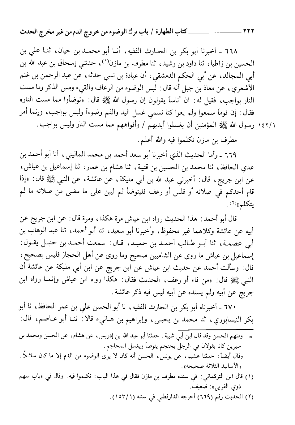 668 - أَخْبَرَنَا أَبُو بَكْرِ بْنُ الْحَارِثِ الْفَقِيهُ، أنا أَبُو مُحَمَّدِ بْنُ حَيَّانَ، ثنا عَلِيٌّ أَبُو الْحُسَنِ بْنُ زَاطِيَا، ثنا دَاوُدُ بْنُ رُشَيْدٍ، ثنا مُطَرِّفُ بْنُ مَازِنَ، حَدَّثَنِي إِسْحَاقُ بْنُ عَبْدِ اللهِ بْنِ أَبِي الْمُجَالِدِ، عَنْ أَبِي الْحَكَمِ الدِّمَشْقِيِّ أَنَّ عُبَادَةَ بْنَ نُسَيٍّ حَدَّثَهُ عَنْ عَبْدِ الرَّحْمَنِ بْنِ غَنْمٍ الْأَشْعَرِيِّ، عَنْ مُعَاذِ بْنِ جَبَلٍ، أَنَّهُ قَالَ: لَيْسَ الْوُضُوءُ مِنَ الرُّعَافِ، وَالْقَيْءِ، وَمَسِّ الذَّكَرِ، وَمَا مَسَّتِ النَّارُ بِوَاجِبٍ فَقِيلَ لَهُ: إِنَّ أُنَاسًا يَقُولُونَ: إِنَّ رَسُولَ اللهِ صَلَّى اللهُ عَلَيْهِ وَسَلَّمَ، قَالَ: " §تَوَضَّئُوا مِمَّا مَسَّتِ النَّارُ " فَقَالَ: إِنَّ قَوْمًا سَمِعُوا وَلَمْ يَعُوا، كُنَّا نُسَمِّي غَسْلَ الْيَدِ وَالْفَمِ وُضُوءًا وَلَيْسَ بِوَاجِبٍ، وَإِنَّمَا أَمَرَ رَسُولُ اللهِ صَلَّى اللهُ عَلَيْهِ وَسَلَّمَ الْمُؤْمِنِينَ أَنْ يَغْسِلُوا أَيْدِيَهُمْ وَأَفْوَاهَهُمْ مِمَّا مَسَّتِ النَّارُ وَلَيْسَ بِوَاجِبٍ مُطَرِّفُ بْنُ مَازِنٍ تَكَلَّمُوا فِيهِ، وَاللهُ أَعْلَمُ