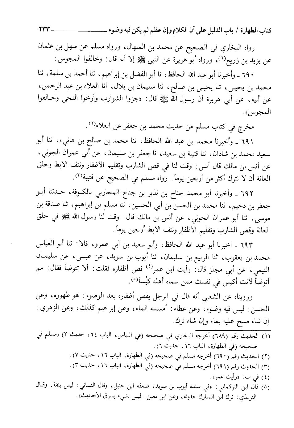 693 - أَخْبَرَنَا أَبُو عَبْدِ اللهِ الْحَافِظُ، وَأَبُو سَعِيدِ بْنُ أَبِي عَمْرٍو، قَالَا: ثنا أَبُو الْعَبَّاسِ مُحَمَّدُ بْنُ يَعْقُوبَ، ثنا الرَّبِيعُ بْنُ سُلَيْمَانَ، ثنا أَيُّوبُ بْنُ سُوَيْدٍ، عَنْ عِيسَى، عَنْ سُلَيْمَانَ التَّيْمِيِّ، عَنْ أَبِي مِجْلَزٍ، قَالَ: رَأَيْتُ ابْنَ عُمَرَ قَصَّ أَظْفَارَهُ، فَقُلْتُ: أَلَا تَتَوَضَّأُ؟، فَقَالَ: " مِمَّ أَتَوَضَّأُ §لَأَنْتَ أَكْيَسُ فِي نَفْسِكَ مِمَّنْ سَمَّاهُ أَهْلُهُ كَيِّسًا " وَرُوِّينَاهُ عَنِ الشَّعْبِيِّ أَنَّهُ قَالَ فِي الرَّجُلِ يَقُصُّ أَظْفَارَهُ بَعْدَ الْوُضُوءِ: هُوَ طُهُورُهُ، وَعَنِ الْحَسَنِ، لَيْسَ فِيهِ وُضُوءٌ، وَعَنْ عَطَاءٍ أَمْسِسْهُ الْمَاءَ، وَعَنْ إِبْرَاهِيمَ، كَذَلِكَ، وَعَنِ الزُّهْرِيِّ، إِنْ شَاءَ مَسَحَ عَلَيْهِ بِمَاءٍ وَإِنْ شَاءَ تَرَكَ