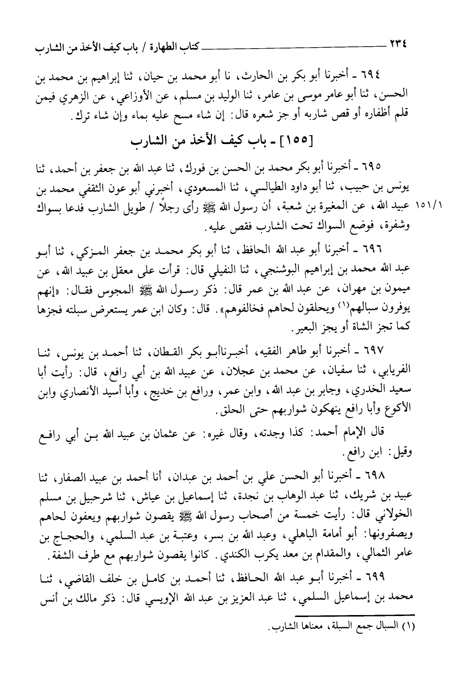 699 - أَخْبَرَنَا أَبُو عَبْدِ اللهِ الْحَافِظُ، ثنا أَحْمَدُ بْنُ كَامِلِ بْنِ خَلَفٍ الْقَاضِي، ثنا مُحَمَّدُ بْنُ إِسْمَاعِيلَ السُّلَمِيُّ، ثنا عَبْدُ الْعَزِيزِ بْنِ عَبْدِ اللهِ الْأُوَيْسِيُّ، قَالَ: ذَكَرَ مَالِكُ بْنُ أَنَسَ -[235]- إِحْفَاءَ بَعْضِ النَّاسِ شَوَارِبَهُمْ، فَقَالَ مَالِكٌ: §" يَنْبَغِي أَنْ يُضْرَبَ مَنْ صَنَعَ ذَلِكَ فَلَيْسَ حَدِيثُ النَّبِيِّ صَلَّى اللهُ عَلَيْهِ وَسَلَّمَ فِي الْإِحْفَاءِ، وَلَكِنْ يُبْدِي حَرْفَ الشَّفَتَيْنِ وَالْفَمَ "، قَالَ مَالِكُ بْنُ أَنَسٍ: " حَلْقُ الشَّارِبِ بِدْعَةٌ ظَهَرَتْ فِي النَّاسِ "