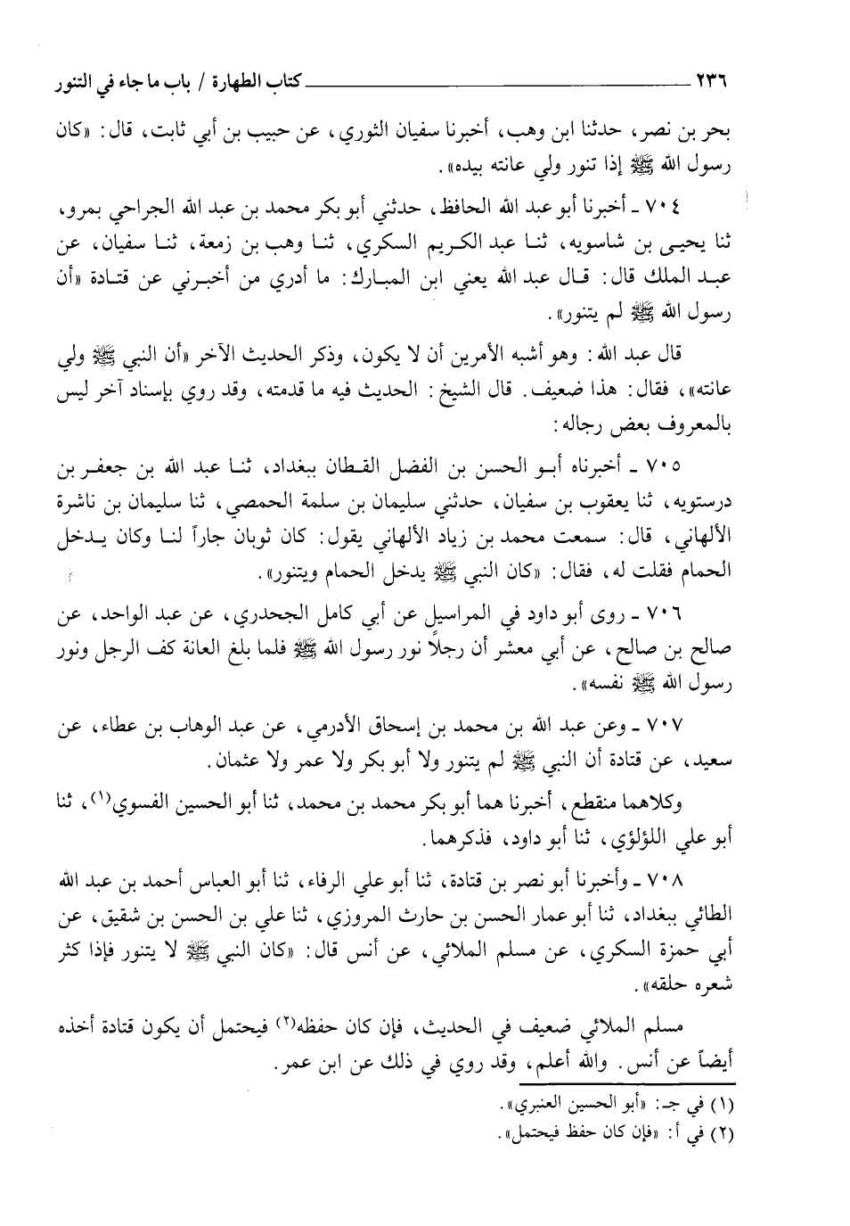 707 - وَعَنْ عَبْدِ اللهِ بْنِ مُحَمَّدِ بْنِ إِسْحَاقَ الْأَدْرَمِيُّ، عَنْ عَبْدِ الْوَهَّابِ بْنِ عَطَاءٍ، عَنْ سَعِيدٍ، عَنْ قَتَادَةَ " أَنَّ النَّبِيَّ صَلَّى اللهُ عَلَيْهِ وَسَلَّمَ §لَمْ يَتَنَوَّرْ، وَلَا أَبُو بَكْرٍ، وَلَا عُمَرُ، وَلَا عُثْمَانُ ". وَكِلَاهُمَا مُنْقَطِعٌ، أَخْبَرَنَاهُمَا أَبُو بَكْرٍ مُحَمَّدُ بْنُ مُحَمَّدٍ، ثنا أَبُو الْحُسَيْنِ الْفَسَوِيُّ، ثنا أَبُو عَلِيٍّ اللُّؤْلُئيُّ، ثنا أَبُو دَاوُدَ فَذَكَرَهُمَا