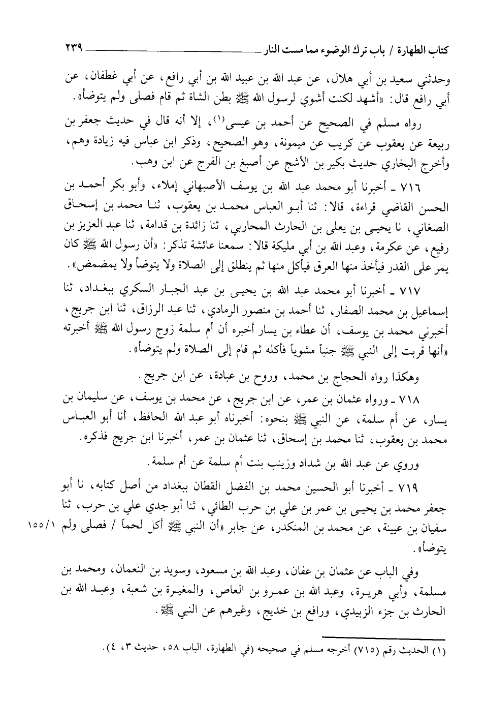 719 - أَخْبَرَنَا أَبُو الْحُسَيْنِ مُحَمَّدُ بْنُ الْفَضْلِ الْقَطَّانُ بِبَغْدَادَ مِنْ أَصْلِ كِتَابِهِ، نا أَبُو جَعْفَرٍ مُحَمَّدُ بْنُ يَحْيَى بْنِ عُمَرَ بْنِ عَلِيِّ بْنِ حَرْبِ الطَّائِيُّ، ثنا أَبُو جَدِّي عَلِيُّ بْنُ حَرْبٍ، ثنا سُفْيَانُ بْنُ عُيَيْنَةَ، عَنْ مُحَمَّدِ بْنِ الْمُنْكَدِرِ، عَنْ جَابِرٍ، أَنَّ النَّبِيَّ صَلَّى اللهُ عَلَيْهِ وَسَلَّمَ §" أَكَلَ لَحْمًا فَصَلَّى وَلَمْ يَتَوَضَّأْ ". وَفِي الْبَابِ عَنْ: عُثْمَانَ بْنِ عَفَّانَ، وَعَبْدِ اللهِ بْنِ مَسْعُودٍ، وَسُوَيْدِ بْنِ النُّعْمَانِ، وَمُحَمَّدِ بْنِ مَسْلَمَةَ، وَأَبِي هُرَيْرَةَ، وَعَبْدِ اللهِ بْنِ عَمْرِو بْنِ الْعَاصِ، وَالْمُغِيرَةِ بْنِ شُعْبَةَ، وَعَبْدِ اللهِ بْنِ الْحَارِثِ بْنِ جَزْءٍ الزُّبَيْدِيِّ، وَرَافِعِ بْنِ خَدِيجٍ وَغَيْرِهِمْ، عَنِ النَّبِيِّ صَلَّى اللهُ عَلَيْهِ وَسَلَّمَ. -[240]- قَالَ الْحَسَنُ بْنُ مُحَمَّدِ بْنِ الصَّبَّاحِ الزَّعْفَرَانِيُّ: قَالَ أَبُو عَبْدِ اللهِ الشَّافِعِيُّ: وَقَدْ رُوِيَ عَنِ النَّبِيِّ صَلَّى اللهُ عَلَيْهِ وَسَلَّمَ " الْوُضُوءُ مِمَّا مَسَّتِ النَّارُ وَإِنَّمَا أَرَادَ مَا "