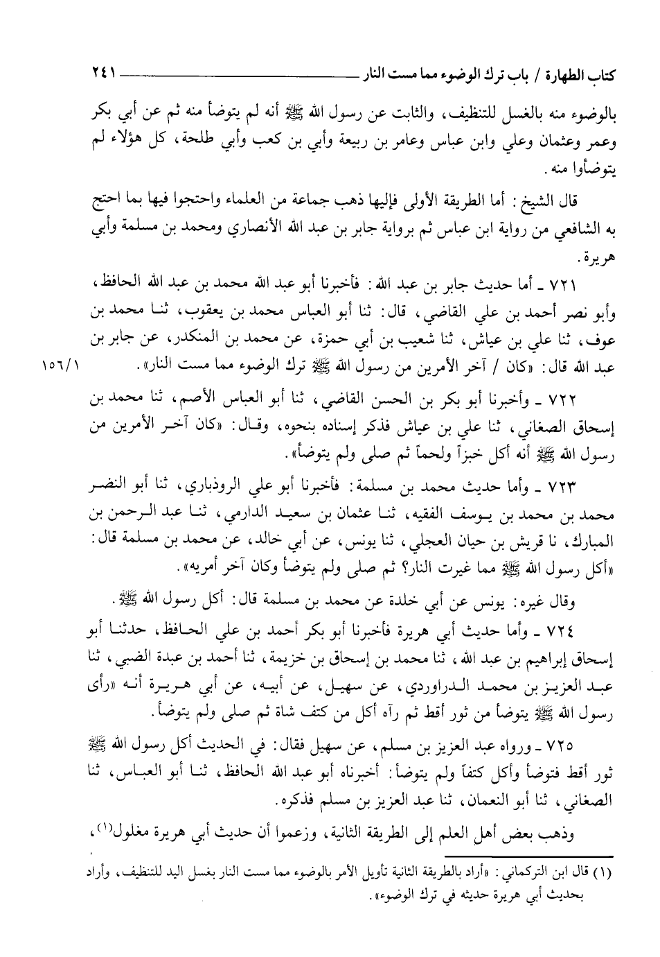 725 - وَرَوَاهُ عَبْدُ الْعَزِيزِ بْنُ مُسْلِمٍ، عَنْ سُهَيْلٍ، فَقَالَ فِي الْحَدِيثِ: أَكَلَ رَسُولُ اللهِ صَلَّى اللهُ عَلَيْهِ وَسَلَّمَ ثَوْرَ أَقِطٍ فَتَوَضَّأَ، وَأَكَلَ كَتِفًا وَلَمْ يَتَوَضَّأْ " أَخْبَرَنَاهُ أَبُو عَبْدِ اللهِ الْحَافِظُ، ثنا أَبُو الْعَبَّاسِ، ثنا الصَّغَانِيُّ، ثنا أَبُو النُّعْمَانِ، ثنا عَبْدُ الْعَزِيزِ بْنُ مُسْلِمٍ فَذَكَرَهُ. وَذَهَبَ بَعْضُ أَهْلِ الْعِلْمِ إِلَى الطَّرِيقَةِ الثَّانِيَةِ، وَزَعَمُوا أَنَّ حَدِيثَ أَبِي هُرَيْرَةَ مَعْلُولٌ، -[242]- وَفَتْوَاهُ بَعْدَ وَفَاةِ النَّبِيِّ صَلَّى اللهُ عَلَيْهِ وَسَلَّمَ بِالْوُضُوءِ مِنْهُ، وَأَنَّ رِوَايَةَ شُعَيْبِ بْنِ أَبِي حَمْزَةَ، عَنْ مُحَمَّدِ بْنِ الْمُنْكَدِرِ اخْتِصَارٌ مِنَ الْحَدِيثِ الَّذِي أَخْبَرَنَا أَبُو زَكَرِيَّا بْنُ أَبِي إِسْحَاقَ، وَأَبُو بَكْرِ بْنُ الْحَسَنِ، قَالَا، حَدَّثَنَا أَبُو الْعَبَّاسِ مُحَمَّدُ بْنُ يَعْقُوبَ، أَنَا مُحَمَّدُ بْنُ عَبْدِ اللهِ بْنِ عَبْدِ الْحَكَمِ، أَخْبَرَنَا ابْنُ وَهْبٍ، قَالَ: وَحَدَّثَنَا بَحْرُ بْنُ نَصْرٍ، قَالَ: قُرِئَ عَلَى ابْنِ وَهْبٍ: أَخْبَرَكَ أُسَامَةُ بْنُ زَيْدٍ، وَابْنَ جُرَيْجٍ، عَنْ مُحَمَّدِ بْنِ الْمُنْكَدِرِ، عَنْ جَابِرِ بْنِ عَبْدِ اللهِ، ذَهَبَ رَسُولُ اللهِ صَلَّى اللهُ عَلَيْهِ وَسَلَّمَ إِلَى امْرَأَةٍ مِنَ الْأَنْصَارِ وَمَعَهُ أَصْحَابُهُ فَقُرِّبَتْ لَهُ شَاةٌ مَصْلِيَّةٌ، قَالَ: فَأَكَلَ وَأَكَلْنَا ثُمَّ حَانَتِ الظُّهْرُ فَتَوَضَّأَ ثُمَّ صَلَّى ثُمَّ رَجَعَ إِلَى فَضْلِ طَعَامِهِ فَأَكَلَ، ثُمَّ حَانَتِ الْعَصْرُ فَصَلَّى وَلَمْ يَتَوَضَّأْ. هَكَذَا رَوَاهُ جَمَاعَةٌ عَنْ مُحَمَّدِ بْنِ الْمُنْكَدِرِ، وَيَرَوْنَ أَنَّ آخِرَ أَمْرَيْهِ أُرِيدَ بِهِ فِي هَذِهِ الْقِصَّةِ قَالَهُ أَبُو دَاوُدَ السِّجِسْتَانِيُّ وَغَيْرُهُ، وَكَذَلِكَ يَرَوْنَ حَدِيثَ مُحَمَّدِ بْنِ مَسْلَمَةَ، وَقَدْ رُوِيَ فِي حَدِيثٍ آخَرَ مَا يُوهِمُ أَنْ يَكُونَ النَّاسِخَ إِيجَابَ الْوُضُوءِ مِنْهُ