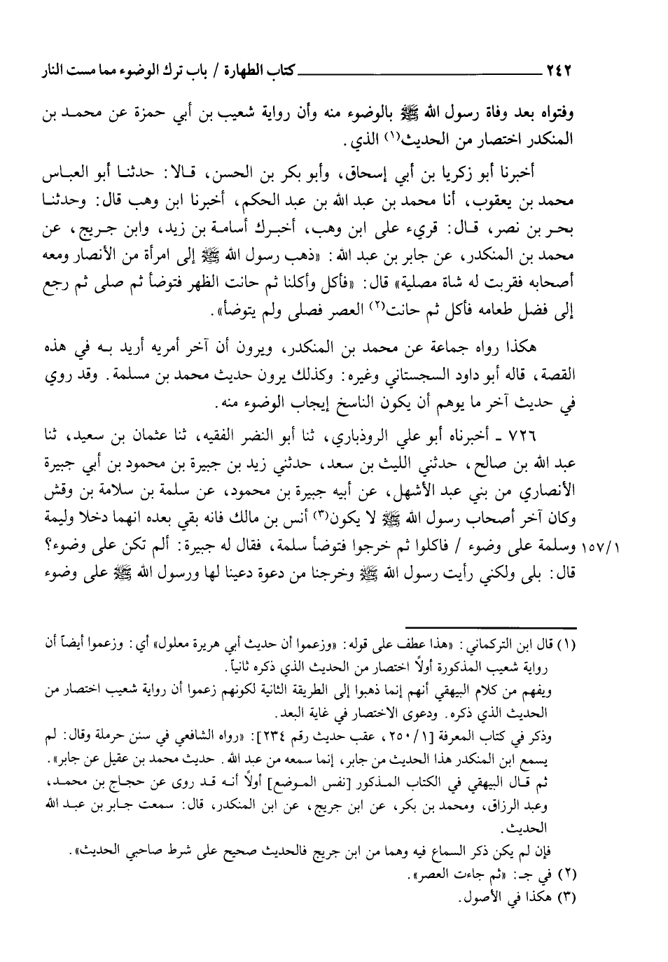 726 - أَخْبَرَنَاهُ أَبُو عَلِيٍّ الرُّوذْبَارِيُّ، ثنا أَبُو النَّضْرِ الْفَقِيهُ، ثنا عُثْمَانُ بْنُ سَعِيدٍ، ثنا عَبْدُ اللهِ بْنُ صَالِحٍ، حَدَّثَنِي اللَّيْثُ بْنُ سَعْدٍ، حَدَّثَنِي زَيْدُ بْنُ جُبَيْرَةَ بْنِ مَحْمُودِ بْنِ أَبِي جُبَيْرَةَ الْأَنْصَارِيُّ مِنْ بَنِي عَبْدِ الْأَشْهَلِ، عَنْ أَبِيهِ جُبَيْرَةَ بْنِ مَحْمُودٍ، عَنْ سَلَمَةَ بْنِ سَلَامَةَ بْنَ وَقْشٍ وَكَانَ آخِرَ أَصْحَابِ رَسُولِ اللهِ صَلَّى اللهُ عَلَيْهِ وَسَلَّمَ، لَا يَكُونُ أَنَسُ بْنُ مَالِكٍ فَإِنَّهُ بَقِيَ بَعْدَهُ: أَنَّهُمَا دَخَلَا وَلِيمَةً وَسَلَمَةُ عَلَى وُضُوءٍ، فَأَكَلُوا ثُمَّ خَرَجُوا فَتَوَضَّأَ سَلَمَةُ، فَقَالَ لَهُ جُبَيْرَةُ أَلَمْ تَكُنْ عَلَى وُضُوءٍ؟ قَالَ: بَلَى، وَلَكِنِّي رَأَيْتُ رَسُولَ اللهِ صَلَّى اللهُ عَلَيْهِ وَسَلَّمَ وَخَرَجْنَا مِنْ دَعْوَةٍ دُعِينَا لَهَا وَرَسُولُ اللهِ صَلَّى اللهُ عَلَيْهِ وَسَلَّمَ عَلَى وُضُوءٍ، -[243]- فَأَكَلَ ثُمَّ تَوَضَّأَ فَقُلْتُ لَهُ: أَلَمْ تَكُنْ عَلَى وُضُوءٍ يَا رَسُولَ اللهِ؟ قَالَ: " بَلَى وَلَكِنِ §الْأُمُورُ تَحْدُثُ وَهَذَا مِمَّا حَدَثَ ". وَإِلَى مِثْلِ هَذَا ذَهَبَ الزُّهْرِيُّ وَهُوَ فِيمَا