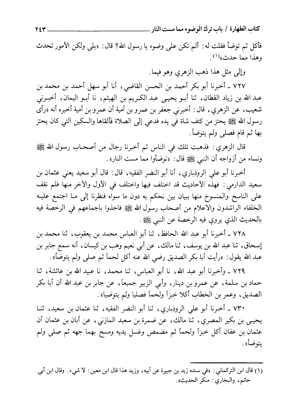 727 - أَخْبَرَنَا أَبُو بَكْرٍ أَحْمَدُ بْنُ الْحَسَنِ الْقَاضِي، أنا أَبُو سَهْلٍ أَحْمَدُ بْنُ مُحَمَّدِ بْنِ عَبْدِ اللهِ بْنِ زِيَادٍ الْقَطَّانُ، ثنا أَبُو يَحْيَى عَبْدِ الْكَرِيمِ بْنِ الْهَيْثَمِ، نا أَبُو الْيَمَانِ، أَخْبَرَنِي شُعَيْبٌ، عَنِ الزُّهْرِيِّ، قَالَ: أَخْبَرَنِي جَعْفَرُ بْنُ عَمْرِو بْنِ أُمَيَّةَ، أَنَّ أَبَاهُ عَمْرَو بْنَ أُمَيَّةَ أَخْبَرَهُ أَنَّهُ §رَأَى رَسُولَ اللهِ صَلَّى اللهُ عَلَيْهِ وَسَلَّمَ يَحْتَزُّ مِنْ كَتِفِ شَاةٍ فِي يَدِهِ فَدُعِيَ إِلَى الصَّلَاةِ فَأَلْقَاهَا وَالسِّكِّينَ الَّتِي كَانَ يَحْتَزُّ بِهَا، ثُمَّ قَامَ فَصَلَّى وَلَمْ يَتَوَضَّأْ، قَالَ الزُّهْرِيُّ: فَذَهَبَتْ تِلْكَ فِي النَّاسِ، ثُمَّ أَخْبَرَنَا رِجَالٌ مِنْ أَصْحَابِ رَسُولِ اللهِ صَلَّى اللهُ عَلَيْهِ وَسَلَّمَ وَنِسَاءٌ مِنْ أَزْوَاجِهِ أَنَّ النَّبِيَّ صَلَّى اللهُ عَلَيْهِ وَسَلَّمَ، قَالَ: " تَوَضَّئُوا مِمَّا مَسَّتِ النَّارُ ". أَخْبَرَنَا أَبُو عَلِيٍّ الرُّوذْبَارِيُّ، أَنَا أَبُو النَّضْرِ الْفَقِيهُ، قَالَ: قَالَ أَبُو سَعِيدٍ يَعْنِي عُثْمَانَ بْنَ سَعِيدٍ الدَّارِمِيَّ، فَهَذِهِ الْأَحَادِيثُ قَدِ اخْتُلِفَ فِيهَا وَاخْتُلِفَ فِي الْأَوَّلِ وَالْآخِرِ مِنْهَا فَلَمْ نقِفْ عَلَى النَّاسِخِ وَالْمَنْسُوخِ مِنْهَا بِبَيَانٍ بَيِّنٍ نَحْكُمُ بِهِ دُونَ مَا سِوَاهُ فَنَظَرْنَا إِلَى مَا اجْتَمَعَ عَلَيْهِ الْخُلَفَاءُ الرَّاشِدُونَ وَالْأَعْلَامُ مِنْ أَصْحَابِ رَسُولِ اللهِ صَلَّى اللهُ عَلَيْهِ وَسَلَّمَ، فَأَخَذُوا بِإِجْمَاعِهِمْ فِي الرُّخْصَةِ فِيهِ بِالْحَدِيثِ الَّذِي يُرْوَى فِيهِ الرُّخْصَةُ عَنِ النَّبِيِّ صَلَّى اللهُ عَلَيْهِ وَسَلَّمَ