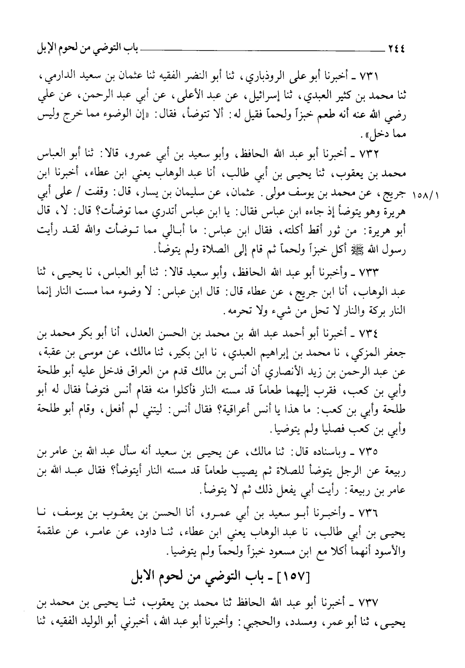 734 - أَخْبَرَنَا أَبُو أَحْمَدَ عَبْدُ اللهِ بْنُ مُحَمَّدِ بْنِ الْحَسَنِ الْعَدْلُ، أنا أَبُو بَكْرٍ مُحَمَّدُ بْنُ جَعْفَرٍ الْمُزَكِّي، نا مُحَمَّدُ بْنُ إِبْرَاهِيمَ الْعَبْدِيُّ، نا ابْنُ بُكَيْرٍ، ثنا مَالِكٌ، عَنْ مُوسَى بْنِ عُقْبَةَ، عَنْ عَبْدِ الرَّحْمَنِ بْنِ زَيْدٍ الْأَنْصَارِيِّ، أَنَّ أَنَسَ بْنَ مَالِكٍ قَدِمَ مِنَ الْعِرَاقِ فَدَخَلَ عَلَيْهِ أَبُو طَلْحَةَ، وَأُبَيُّ بْنُ كَعْبٍ فَقَرَّبَ إِلَيْهِمَا طَعَامًا قَدْ مَسَّتْهُ النَّارُ، فَأَكَلُوا مِنْهُ، فَقَامَ أَنَسٌ فَتَوَضَّأَ، فَقَالَ لَهُ أَبُو طَلْحَةَ، وَأَبِيُّ بْنُ كَعْبٍ: §مَا هَذَا يَا أَنَسُ أَعِرَاقِيَّةٌ؟، فَقَالَ: أَنَسٌ: " لَيْتَنِي لَمْ أَفْعَلْ " وَقَامَ أَبُو طَلْحَةَ وَأُبَيُّ بْنُ كَعْبٍ فَصَلَّيَا وَلَمْ يَتَوَضَّيَا "