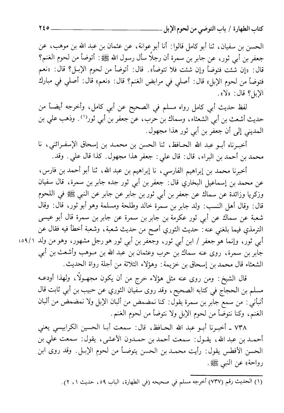 738 - أَخْبَرَنَا أَبُو عَبْدِ اللهِ الْحَافِظُ، قَالَ: سَمِعْتُ أَبَا الْحُسَيْنِ الْكَرَابِيسِيَّ يَعْنِي أَحْمَدَ بْنَ عَبْدِ اللهِ، يَقُولُ: سَمِعْتُ أَحْمَدَ بْنَ حَمْدُونَ الْأَعْشَى، يَقُولُ: سَمِعْتُ عَلِيَّ بْنَ الْحَسَنِ الْأَفْطَسَ، يَقُولُ: " رَأَيْتُ مُحَمَّدَ بْنَ الْحَسَنِ §يَتَوَضَّأُ مِنْ لُحُومِ الْإِبِلِ " وَقَدْ رَوَى ابْنُ رَوَاحَةَ، عَنِ النَّبِيِّ صَلَّى اللهُ عَلَيْهِ وَسَلَّمَ