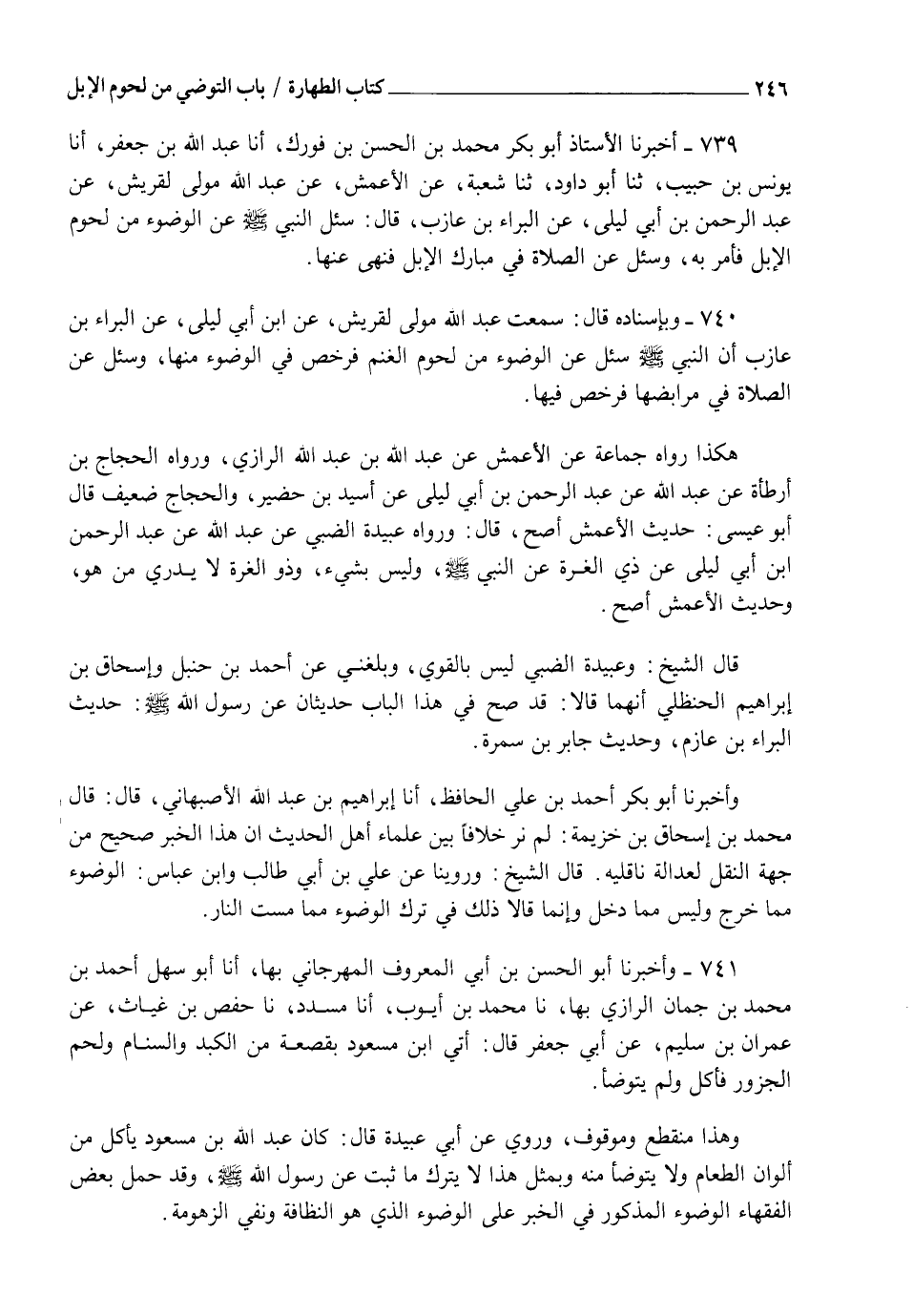 740 - وَبِإِسْنَادِهِ قَالَ: سَمِعْتُ عَبْدَ اللهِ مَوْلًى لِقُرَيْشٍ، عَنِ ابْنِ أَبِي لَيْلَى، عَنِ الْبَرَاءِ بْنِ عَازِبٍ " أَنَّ النَّبِيَّ صَلَّى اللهُ عَلَيْهِ وَسَلَّمَ §سُئِلَ عَنِ الْوُضُوءِ مِنْ لُحُومِ الْغَنَمِ فَرَخَّصَ فِي الْوُضُوءِ مِنْهَا، وَسُئِلَ عَنِ الصَّلَاةِ فِي مَرَابِضِهَا فَرَخَّصَ فِيهَا ". هَكَذَا رَوَاهُ جَمَاعَةٌ عَنِ الْأَعْمَشِ، عَنْ عَبْدِ اللهِ بْنِ عَبْدِ اللهِ الرَّازِيِّ، وَرَوَاهُ الْحَجَّاجُ بْنُ أَرْطَاةَ، عَنْ عَبْدِ اللهِ، عَنْ عَبْدِ الرَّحْمَنِ بْنِ أَبِي لَيْلَى، عَنْ أُسَيْدِ بْنِ حُضَيْرٍ. وَالْحَجَّاجُ ضَعِيفٌ. قَالَ أَبُو عِيسَى: حَدِيثُ الْأَعْمَشِ أَصَحُّ. قَالَ: وَرَوَاهُ عُبَيْدَةُ الضَّبِّيُّ، عَنْ عَبْدِ اللهِ، عَنْ عَبْدِ الرَّحْمَنِ بْنِ أَبِي لَيْلَى، عَنْ ذِي الْغُرَّةِ، عَنِ النَّبِيِّ صَلَّى اللهُ عَلَيْهِ وَسَلَّمَ وَلَيْسَ بِشَيْءٍ وَذُو الْغُرَّةِ لَا يُدْرَى مَنْ هُوَ. وَحَدِيثُ الْأَعْمَشِ أَصَحُّ، قَالَ الشَّيْخُ: وَعُبَيْدَةُ الضَّبِّيُّ لَيْسَ بِالْقَوِيِّ، وَبَلَغَنِي عَنْ أَحْمَدَ بْنِ حَنْبَلٍ، وَإِسْحَاقَ بْنِ إِبْرَاهِيمَ الْحَنْظَلِيَّ أَنَّهُمَا قَالَا: قَدْ صَحَّ فِي هَذَا الْبَابِ حَدِيثَانِ عَنِ النَّبِيِّ صَلَّى اللهُ عَلَيْهِ وَسَلَّمَ، حَدِيثُ الْبَرَاءِ بْنِ عَازِبٍ، وَحَدِيثُ جَابِرِ بْنِ سَمُرَةَ. وَأَخْبَرَنَا أَبُو بَكْرٍ أَحْمَدُ بْنُ عَلِيٍّ الْحَافِظُ، أَنَا إِبْرَاهِيمُ بْنُ عَبْدِ اللهِ الْأَصْبَهَانِيُّ، قَالَ: قَالَ مُحَمَّدُ بْنُ إِسْحَاقَ بْنِ خُزَيْمَةَ: لَمْ نَرَ خِلَافًا بَيْنَ عُلَمَاءِ أَهْلِ الْحَدِيثِ أَنَّ هَذَا الْخَبَرَ صَحِيحٌ مِنْ جِهَةِ النَّقْلِ لِعَدَالَةِ نَاقِلِيهِ. قَالَ الشَّيْخُ: وَرُوِّينَا عَنْ عَلِيِّ بْنِ أَبِي طَالِبٍ، وَابْنِ عَبَّاسٍ الْوُضُوءَ مِمَّا خَرَجَ وَلَيْسَ مِمَّا دَخَلَ، وَإِنَّمَا قَالَا ذَلِكَ فِي تَرْكِ الْوُضُوءِ مِمَّا مَسَّتِ النَّارُ