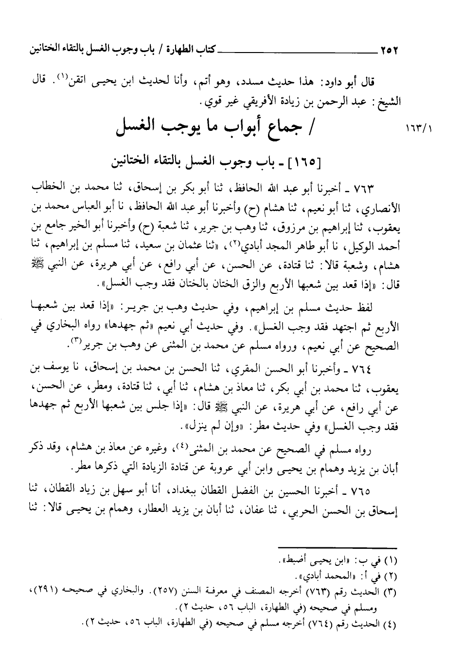 763 - أَخْبَرَنَا أَبُو عَبْدِ اللهِ الْحَافِظُ، ثنا أَبُو بَكْرِ بْنُ إِسْحَاقَ، ثنا مُحَمَّدُ بْنُ الْخَطَّابِ الْأَنْصَارِيُّ، ثنا أَبُو نُعَيْمٍ، ثنا هِشَامٌ، وَأَخْبَرَنَا أَبُو عَبْدِ اللهِ الْحَافِظُ، نا أَبُو الْعَبَّاسِ مُحَمَّدُ بْنُ يَعْقُوبَ، ثنا إِبْرَاهِيمُ بْنُ مَرْزُوقٍ، ثنا وَهْبُ بْنُ جَرِيرٍ، ثنا شُعْبَةُ، وَأَخْبَرَنَا أَبُو الْخَيْرِ جَامِعُ بْنُ أَحْمَدَ الْوَكِيلُ، نا أَبُو طَاهِرٍ الْمَجْدَ آبَاذِيُّ، ثنا عُثْمَانُ بْنُ سَعِيدٍ، ثنا مُسْلِمُ بْنُ إِبْرَاهِيمَ، ثنا هِشَامٌ، وَشُعْبَةُ، قَالَا: ثنا قَتَادَةُ، عَنِ الْحَسَنِ، عَنْ أَبِي رَافِعٍ، عَنْ أَبِي هُرَيْرَةَ، عَنِ النَّبِيِّ صَلَّى اللهُ عَلَيْهِ وَسَلَّمَ، قَالَ: §" إِذَا قَعَدَ بَيْنَ شُعَبِهَا الْأَرْبَعِ وَأَلْزَقَ الْخِتَانَ بِالْخِتَانِ فَقَدْ وَجَبَ الْغُسْلُ " لَفْظُ حَدِيثِ مُسْلِمِ بْنِ إِبْرَاهِيمَ، وَفِي حَدِيثِ وَهْبِ بْنِ جَرِيرٍ " إِذَا قَعَدَ بَيْنَ شُعَبِهَا الْأَرْبَعِ ثُمَّ اجْتَهَدَ فَقَدْ وَجَبَ الْغُسْلُ ". وَفِي حَدِيثِ أَبِي نُعَيْمٍ " ثُمَّ جَهَدَهَا ". رَوَاهُ الْبُخَارِيُّ فِي الصَّحِيحِ عَنْ أَبِي نُعَيْمٍ. وَرَوَاهُ مُسْلِمٌ عَنْ مُحَمَّدِ بْنِ الْمُثَنَّى، عَنْ وَهْبِ بْنِ جَرِيرٍ