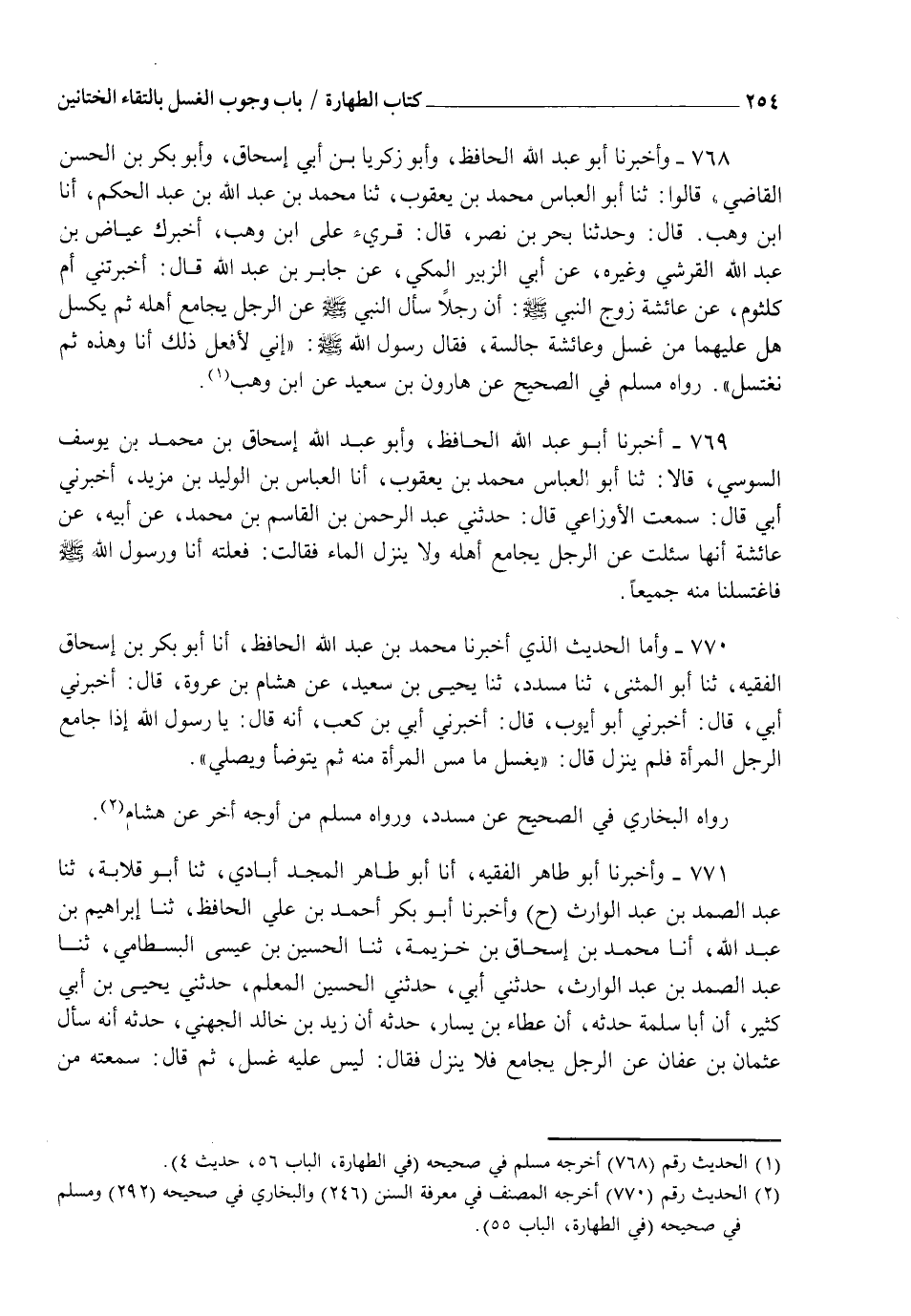 770 - وَأَمَّا الْحَدِيثُ الَّذِي أَخْبَرَنَا مُحَمَّدُ بْنُ عَبْدِ اللهِ الْحَافِظُ، أنا أَبُو بَكْرِ بْنُ إِسْحَاقَ الْفَقِيهُ، ثنا أَبُو الْمُثَنَّى، ثنا مُسَدَّدٌ، ثنا يَحْيَى بْنُ سَعِيدٍ، عَنْ هِشَامِ بْنِ عُرْوَةَ، قَالَ: أَخْبَرَنِي أَبِي، قَالَ: أَخْبَرَنِي أَبُو أَيُّوبَ، قَالَ: أَخْبَرَنِي أُبَيُّ بْنُ كَعْبٍ أَنَّهُ قَالَ: يَا رَسُولَ اللهِ إِذَا جَامَعَ الرَّجُلُ الْمَرْأَةَ فَلَمْ يُنْزِلْ، قَالَ: " §يَغْسِلُ مَا مَسَّ الْمَرْأَةَ مِنْهُ، ثُمَّ يَتَوَضَّأُ وَيُصَلِّي ". رَوَاهُ الْبُخَارِيُّ فِي الصَّحِيحِ عَنْ مُسَدَّدٍ. وَرَوَاهُ مُسْلِمٌ مِنْ أَوْجُهٍ أُخَرَ عَنْ هِشَامٍ