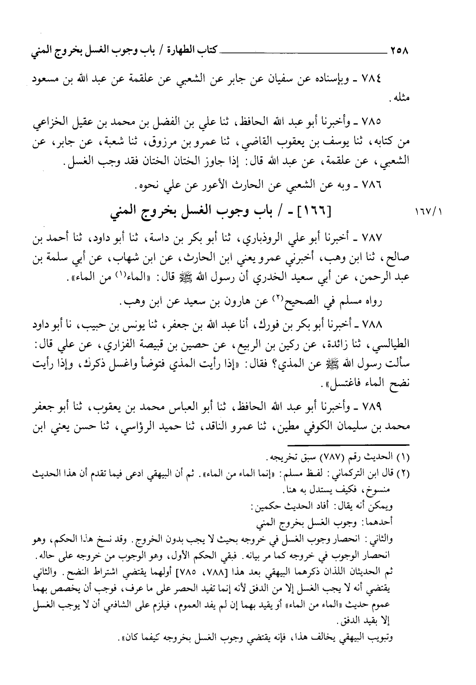 787 - أَخْبَرَنَا أَبُو عَلِيٍّ الرُّوذْبَارِيُّ، ثنا أَبُو بَكْرِ بْنُ دَاسَةَ، ثنا أَبُو دَاوُدَ، ثنا أَحْمَدُ بْنُ صَالِحٍ، ثنا ابْنُ وَهْبٍ، أَخْبَرَنِي عَمْرٌو يَعْنِي ابْنَ الْحَارِثِ، عَنِ ابْنِ شِهَابٍ، عَنْ أَبِي سَلَمَةَ بْنِ عَبْدِ الرَّحْمَنِ، عَنْ أَبِي سَعِيدٍ الْخُدْرِيِّ، أَنَّ رَسُولَ اللهِ صَلَّى اللهُ عَلَيْهِ وَسَلَّمَ، قَالَ: §" الْمَاءُ مِنَ الْمَاءِ ". رَوَاهُ مُسْلِمٌ فِي الصَّحِيحِ عَنْ هَارُونَ بْنِ سَعِيدٍ عَنِ ابْنِ وَهْبٍ