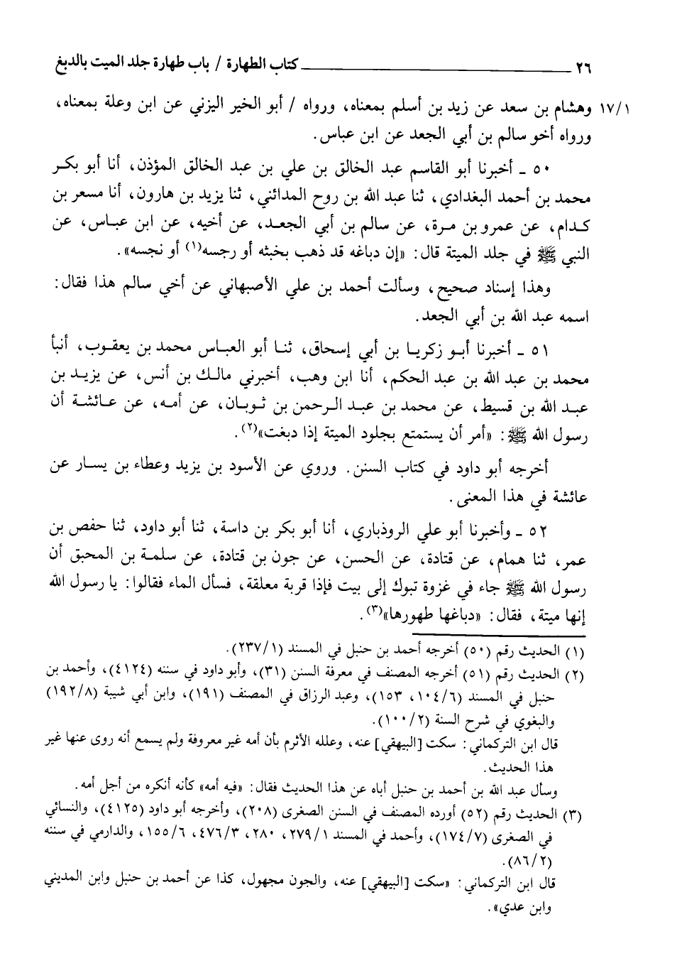 50 - كَمَا أَخْبَرَنَا أَبُو الْقَاسِمِ عَبْدُ الْخَالِقِ بْنُ عَلِيِّ بْنِ عَبْدِ الْخَالِقِ الْمُؤَذِّنُ، أنا أَبُو بَكْرٍ مُحَمَّدُ بْنُ أَحْمَدَ الْبَغْدَادِيُّ، ثنا عَبْدُ اللهِ بْنُ رَوْحٍ الْمَدَائِنِيُّ، ثنا يَزِيدُ بْنُ هَارُونَ، أنا مِسْعَرُ بْنُ كِدَامٍ، عَنْ عَمْرِو بْنِ مُرَّةَ، عَنْ سَالِمِ بْنِ أَبِي الْجَعْدِ، عَنْ أَخِيهِ، عَنِ ابْنِ عَبَّاسٍ، عَنِ النَّبِيِّ صَلَّى اللهُ عَلَيْهِ وَسَلَّمَ فِي جِلْدِ الْمَيْتَةِ قَالَ: " إِنَّ §دِبَاغَهُ قَدْ ذَهَبَ بِخَبَثِهِ أَوْ رِجْسِهِ أَوْ نَجَسِهِ ". وَهَذَا إِسْنَادٌ صَحِيحٌ. وَسَأَلْتُ أَحْمَدَ بْنَ عَلِيٍّ الْأَصْبَهَانِيَّ، عَنْ أَخِي سَالِمٍ هَذَا فَقَالَ: اسْمُهُ عَبْدُ اللهِ بْنُ أَبِي الْجَعْدِ