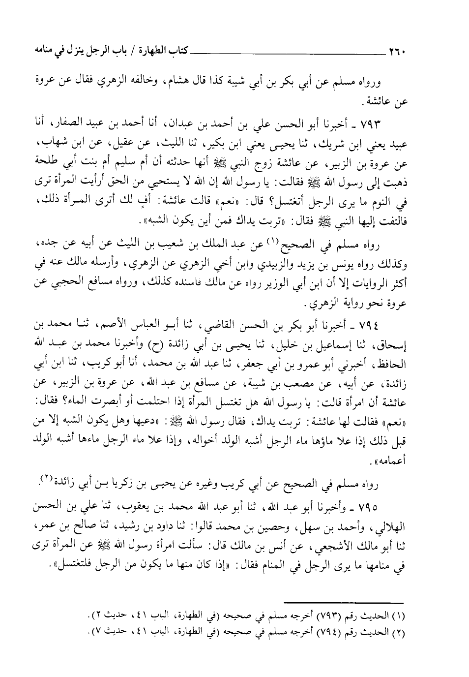 793 - أَخْبَرَنَا أَبُو الْحَسَنِ عَلِيُّ بْنُ أَحْمَدَ بْنِ عَبْدَانَ، أنا أَحْمَدُ بْنُ عُبَيْدٍ الصَّفَّارُ، أنا عُبَيْدٌ يَعْنِي ابْنَ شَرِيكٍ، ثنا يَحْيَى يَعْنِي ابْنَ بُكَيْرٍ، ثنا اللَّيْثُ، عَنْ عُقَيْلٍ، عَنِ ابْنِ شِهَابٍ، عَنْ عُرْوَةَ بْنِ الزُّبَيْرِ، عَنْ عَائِشَةَ زَوْجِ النَّبِيِّ صَلَّى اللهُ عَلَيْهِ وَسَلَّمَ، أَنَّهَا حَدَّثَتْهُ أَنَّ أُمَّ سُلَيْمٍ أُمَّ بِنْتِ أَبِي طَلْحَةَ ذَهَبَتْ إِلَى رَسُولِ اللهِ صَلَّى اللهُ عَلَيْهِ وَسَلَّمَ، فَقَالَتْ: يَا رَسُولَ اللهِ، إِنَّ §اللهَ لَا يَسْتَحْيِي مِنَ الْحَقِّ، أَرَأَيْتَ الْمَرْأَةَ تَرَى فِي النَّوْمِ مَا يَرَى الرَّجُلَ أَتَغْتَسِلُ؟ قَالَ: " نَعَمْ "، قَالَتْ عَائِشَةُ: أُفٍّ لَكِ أَتَرَى الْمَرْأَةُ ذَلِكَ فَالْتَفَتَ إِلَيْهَا النَّبِيُّ صَلَّى اللهُ عَلَيْهِ وَسَلَّمَ فَقَالَ: " تَرِبَتْ يَدَاكِ، فَمِنْ أَيْنَ يَكُونُ الشَّبَهُ ". رَوَاهُ مُسْلِمٌ فِي الصَّحِيحِ عَنْ عَبْدِ الْمَلِكِ بْنِ شُعَيْبِ بْنِ اللَّيْثِ، عَنْ أَبِيهِ، عَنْ جَدِّهِ. وَكَذَلِكَ رَوَاهُ يُونُسُ بْنُ يَزِيدَ، وَالزُّبَيْدِيُّ، وَابْنُ أَخِي الزُّهْرِيِّ، عَنِ الزُّهْرِيِّ، وَأَرْسَلَهُ مَالِكٌ عَنْهُ فِي أَكْثَرِ الرِّوَايَاتِ إِلَّا أَنَّ ابْنَ أَبِي الْوَزِيرِ رَوَاهُ عَنْ مَالِكٍ فَأَسْنَدَهُ كَذَلِكَ، وَرَوَاهُ مُسَافِعٌ الْحَجَبِيُّ، عَنْ عُرْوَةَ نَحْوَ رِوَايَةِ الزُّهْرِيِّ