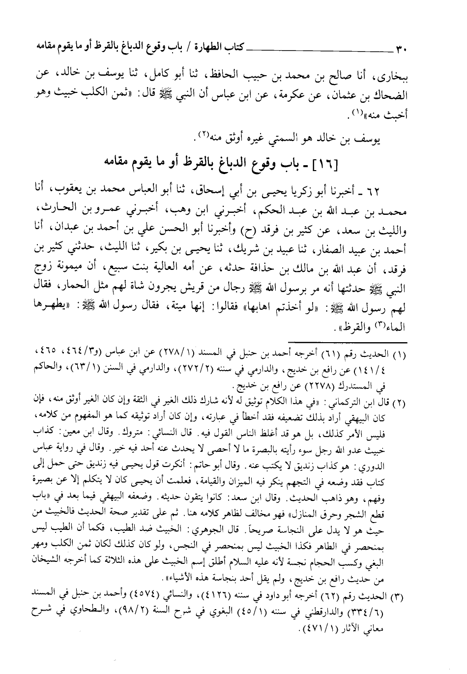 62 - أَخْبَرَنَا أَبُو زَكَرِيَّا يَحْيَى بْنُ إِسْحَاقَ، ثنا أَبُو الْعَبَّاسٍ مُحَمَّدُ بْنُ يَعْقُوبَ، أنا مُحَمَّدُ بْنُ عَبْدِ اللهِ بْنِ عَبْدِ الْحَكَمِ، أَخْبَرَنِي ابْنُ وَهْبٍ، أَخْبَرَنِي عَمْرُو بْنُ الْحَارِثِ، وَاللَّيْثُ بْنُ سَعْدٍ، عَنْ كَثِيرِ بْنِ فَرْقَدٍ، ح وَأَخْبَرَنَا أَبُو الْحَسَنِ عَلِيُّ بْنُ أَحْمَدَ بْنِ عَبْدَانَ، أنا أَحْمَدُ بْنُ عُبَيْدٍ الصَّفَّارُ، ثنا عُبَيْدُ بْنُ شَرِيكٍ، ثنا يَحْيَى بْنُ بُكَيْرٍ، ثنا اللَّيْثُ، حَدَّثَنِي كَثِيرُ بْنُ فَرْقَدٍ، أَنَّ عَبْدَ اللهِ بْنَ مَالِكِ بْنِ حُذَافَةَ، حَدَّثَهُ، عَنْ أُمِّهِ الْعَالِيَةِ بِنْتِ سُبَيْعٍ، أَنَّ مَيْمُونَةَ زَوْجَ النَّبِيِّ صَلَّى اللهُ عَلَيْهِ وَسَلَّمَ، حَدَّثَتْهَا أَنَّهُ مَرَّ بِرَسُولِ اللهِ صَلَّى اللهُ عَلَيْهِ وَسَلَّمَ رِجَالٌ مِنْ قُرَيْشٍ يَجُرُّونَ شَاةً لَهُمْ مِثْلَ الْحِمَارِ، فَقَالَ لَهُمْ رَسُولُ اللهِ صَلَّى اللهُ عَلَيْهِ وَسَلَّمَ: " لَوْ أَخَذْتُمْ إِهَابَهَا ". فَقَالُوا: إِنَّهَا مَيْتَةٌ؟ فَقَالَ رَسُولُ اللهِ صَلَّى اللهُ عَلَيْهِ وَسَلَّمَ: §" يُطَهِّرُهَا الْمَاءُ وَالْقَرَظُ " -[31]- هَكَذَا لَفْظُ حَدِيثِ ابْنِ وَهْبٍ إِلَّا أَنَّهُ قَالَ: عَنْ أُمِّ الْعَالِيَةِ