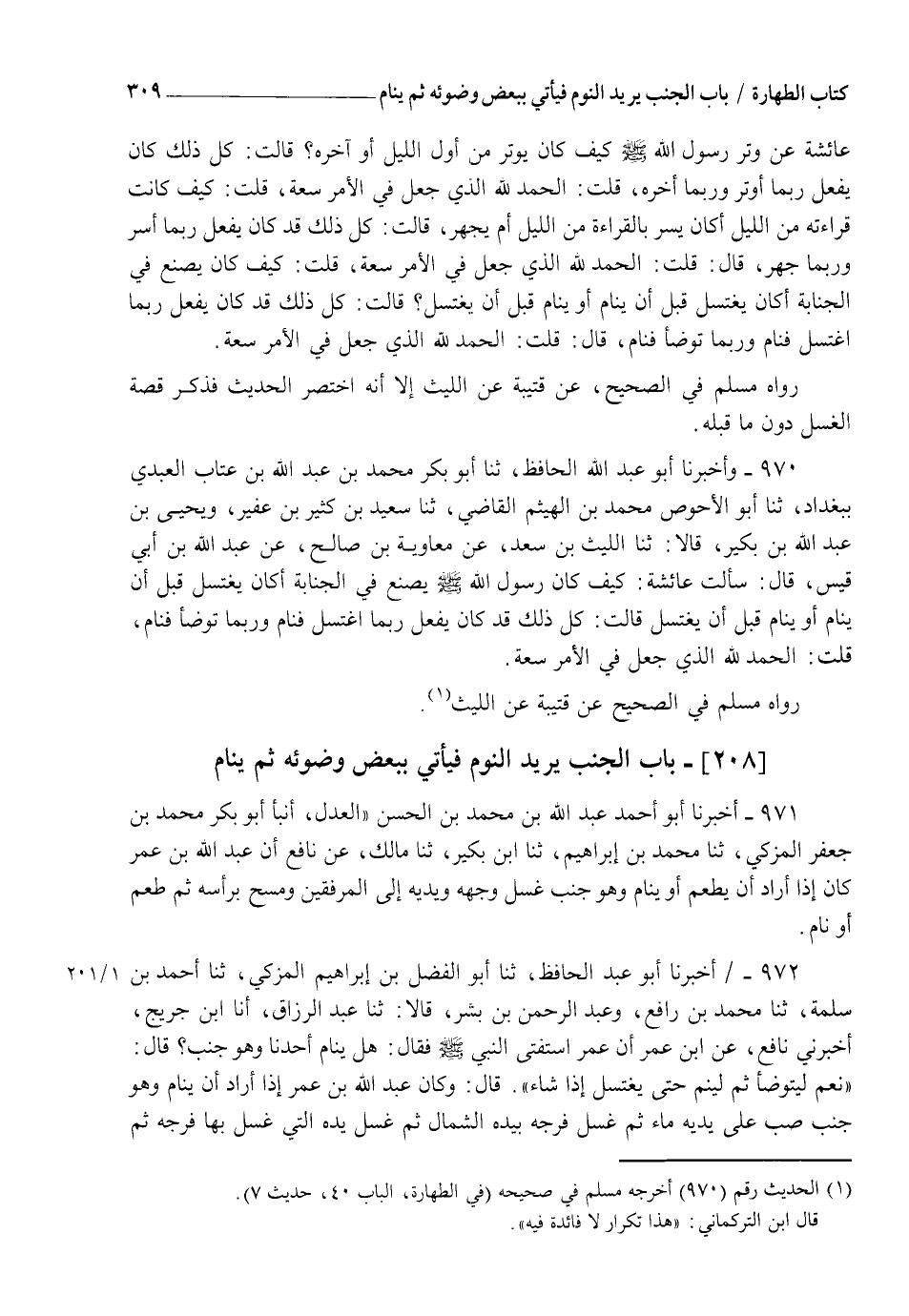 972 - أَخْبَرَنَا أَبُو عَبْدِ اللهِ الْحَافِظُ، ثنا أَبُو الْفَضْلِ بْنُ إِبْرَاهِيمَ الْمُزَكِّي، ثنا أَحْمَدُ بْنُ سَلَمَةَ، ثنا مُحَمَّدُ بْنُ رَافِعٍ، وَعَبْدُ الرَّحْمَنِ بْنُ بِشْرٍ، قَالَا: ثنا عَبْدُ الرَّزَّاقِ، أنا ابْنُ جُرَيْجٍ، أَخْبَرَنِي نَافِعٌ، عَنِ ابْنِ عُمَرَ، أَنَّ عُمَرَ اسْتَفْتَى النَّبِيَّ صَلَّى اللهُ عَلَيْهِ وَسَلَّمَ، فَقَالَ: §هَلْ يَنَامُ أَحَدُنَا وَهُوَ جُنُبٌ؟ قَالَ: " نَعَمْ لِيَتَوَضَّأْ، ثُمَّ لِيَنَمْ حَتَّى يَغْتَسِلَ إِذَا شَاءَ ". قَالَ: وَكَانَ عَبْدُ اللهِ بْنُ عُمَرَ " إِذَا أَرَادَ أَنْ يَنَامَ وَهُوَ جُنُبٌ صَبَّ عَلَى يَدَيْهِ مَاءً، ثُمَّ غَسَلَ فَرْجَهُ بِيَدِهِ الشِّمَالِ، ثُمَّ غَسَلَ يَدَهُ الَّتِي غَسَلَ بِهَا فَرْجَهُ، ثُمَّ -[310]- تَمَضْمَضَ وَاسْتَنْشَقَ، وَنَضَحَ فِي عَيْنَيْهِ وَغَسَلَ وَجْهَهُ وَيَدَيْهِ إِلَى الْمِرْفَقَيْنِ، وَمَسَحَ بِرَأْسِهِ، ثُمَّ نَامَ وَإِذَا أَرَادَ أَنْ يَطْعَمَ شَيْئًا وَهُوَ جُنُبٌ فَعَلَ ذَلِكَ ". أَخْرَجَهُ مُسْلِمٌ عَنْ مُحَمَّدِ بْنِ رَافِعٍ، دُونَ فِعْلِ ابْنِ عُمَرَ وَهُوَ الرَّاوِي لِلْخَبَرِ قَدْ يُشْبِهُ أَنْ يَكُونَ تَفْسِيرَ الْوُضُوءِ الْمَذْكُورِ فِي الْخَبَرِ إِلَّا أَنَّ عَائِشَةَ رَضِيَ اللهُ عَنْهَا قَدْ رَوَتْ، عَنِ النَّبِيِّ صَلَّى اللهُ عَلَيْهِ وَسَلَّمَ أَنَّهُ تَوَضَّأَ وُضُوءَهُ لِلصَّلَاةِ، وَوُضُوءُ الصَّلَاةِ يَشْتَمِلُ عَلَى غَسْلِ الرَّجُلَيْنِ مَعَ سَائِرِ الْأَعْضَاءِ وَاللهُ أَعْلَمُ وَالَّذِي رُوِيَ عَنِ ابْنِ عَبَّاسٍ أَنَّ النَّبِيَّ صَلَّى اللهُ عَلَيْهِ وَسَلَّمَ قَامَ مِنَ اللَّيْلِ فَقَضَى حَاجَتَهُ، ثُمَّ غَسَلَ وَجْهَهُ وَيَدَيْهِ، ثُمَّ نَامَ لَيْسَ يُرِيدُ بِهِ الْوَطْءَ وَإِنَّمَا أَرَادَ بِهِ الْحَدَثَ وَسِيَاقُ الْحَدِيثِ يَدُلُّ عَلَى ذَلِكَ وَقَدْ مَضَى ذِكْرُهُ وَسَيَأْتِي تَمَامُهُ إِنْ شَاءَ اللهُ تَعَالَى