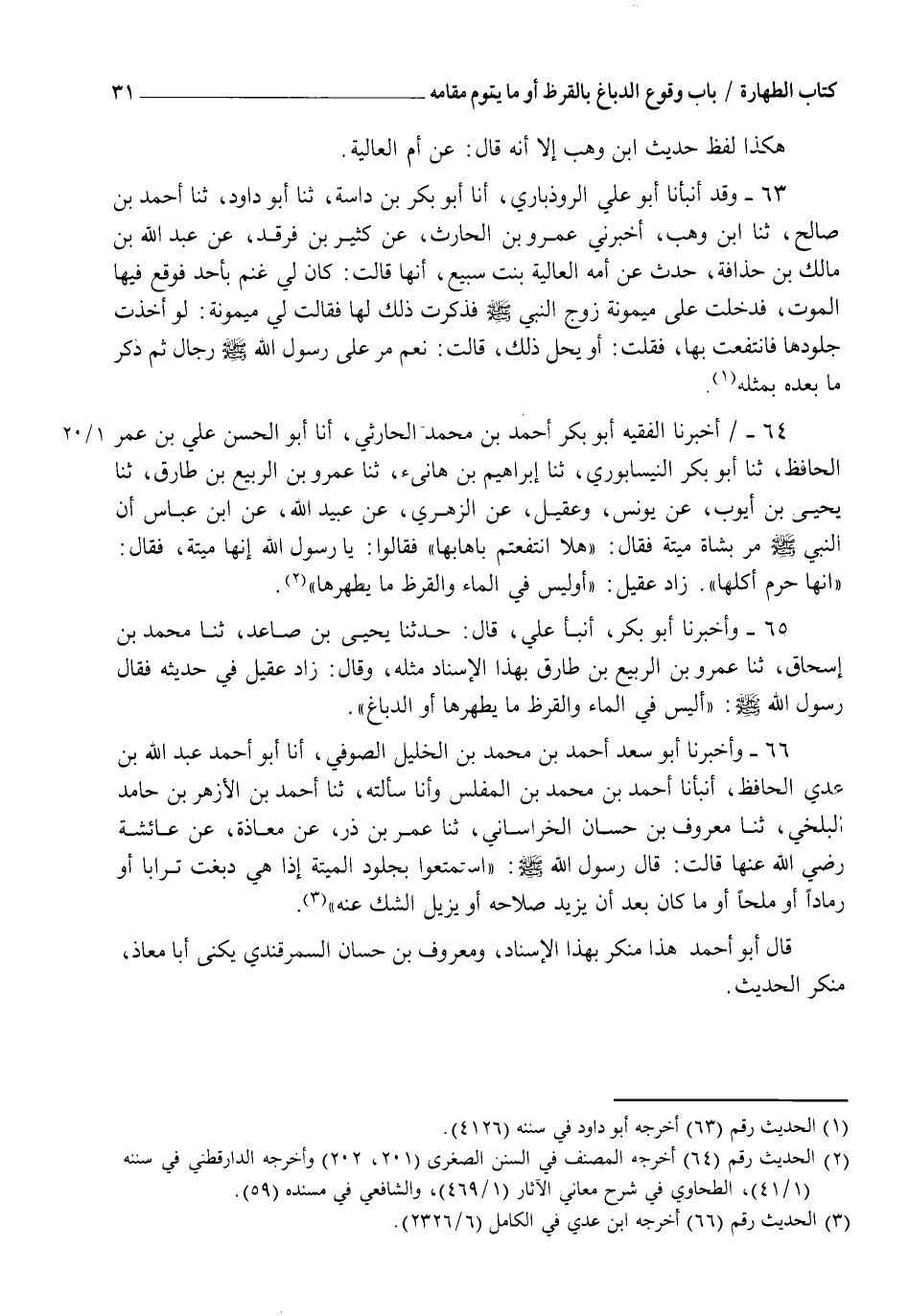 66 - وَأَخْبَرَنَا أَبُو سَعْدٍ أَحْمَدُ بْنُ مُحَمَّدِ بْنِ الْخَلِيلِ الصُّوفِيُّ، أنا أَبُو أَحْمَدَ عَبْدُ اللهِ بْنُ عَدِيٍّ الْحَافِظُ، أنبأ أَحْمَدُ بْنُ مُحَمَّدِ بْنِ الْمُفْلِسِ - وَأَنَا سَأَلْتُهُ - ثنا أَحْمَدُ بْنُ الْأَزْهَرِ بْنِ حَامِدٍ الْبَلْخِيُّ، ثنا مَعْرُوفُ بْنُ حَسَّانَ الْخُرَاسَانِيُّ، ثنا عُمَرُ بْنُ ذَرٍّ، عَنْ مُعَاذَةَ، عَنْ عَائِشَةَ رَضِيَ اللهُ عَنْهَا، قَالَتْ: قَالَ رَسُولُ اللهِ صَلَّى اللهُ عَلَيْهِ وَسَلَّمَ: " §اسْتَمْتِعُوا بِجُلُودِ الْمَيْتَةِ إِذَا هِيَ دُبِغَتْ تُرَابًا، أَوْ رَمَادًا، أَوْ مِلْحًا، أَوْ مَا كَانَ بَعْدَ أَنْ يَزِيدَ صَلَاحُهُ، أَوْ يُزِيلَ الشَّكَّ عَنْهُ ". قَالَ أَبُو أَحْمَدَ: هَذَا مُنْكَرٌ بِهَذَا الْإِسْنَادِ، وَمَعْرُوفُ بْنُ حَسَّانَ السَّمَرْقَنْدِيُّ يَكْنِي أَبَا مُعَاذٍ مُنْكَرُ الْحَدِيثِ