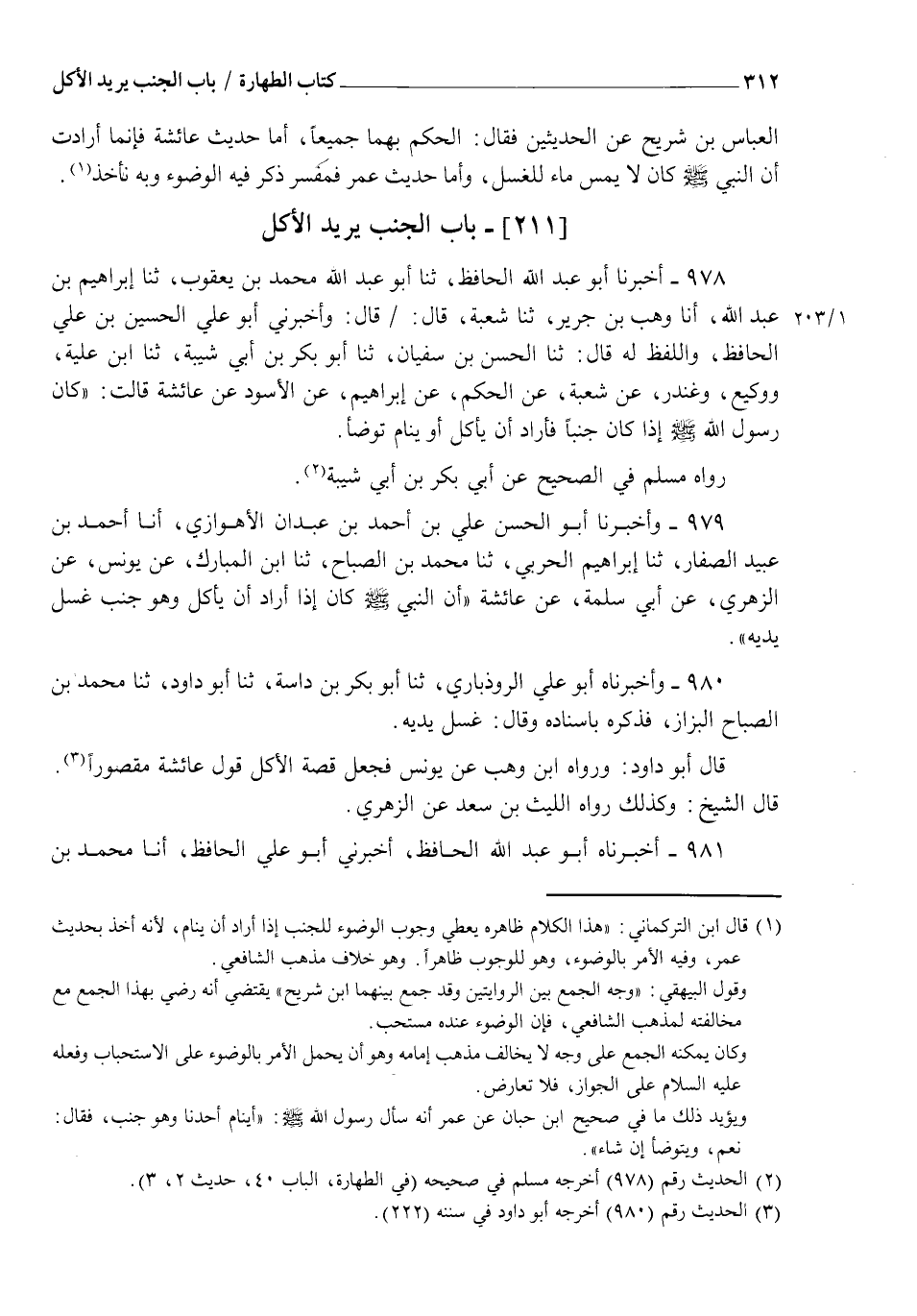 978 - أَخْبَرَنَا أَبُو عَبْدِ اللهِ الْحَافِظُ، ثنا عَبْدُ اللهِ مُحَمَّدُ بْنُ يَعْقُوبَ، ثنا إِبْرَاهِيمُ بْنُ عَبْدِ اللهِ، أنا وَهْبُ بْنُ جَرِيرٍ، ثنا شُعْبَةُ، قَالَ: قَالَ: وَأَخْبَرَنِي أَبُو عَلِيٍّ الْحُسَيْنُ بْنُ عَلِيٍّ الْحَافِظُ، وَاللَّفْظُ لَهُ قَالَ: ثنا الْحَسَنُ بْنُ سُفْيَانَ، ثنا أَبُو بَكْرِ بْنُ أَبِي شَيْبَةَ، ثنا ابْنُ عُلَيَّةَ، وَوَكِيعٌ، وَغُنْدَرٌ، عَنْ شُعْبَةَ، عَنِ الْحَكَمِ، عَنْ إِبْرَاهِيمَ، عَنِ الْأَسْوَدِ، عَنْ عَائِشَةَ، قَالَتْ: كَانَ رَسُولُ اللهِ صَلَّى اللهُ عَلَيْهِ وَسَلَّمَ §" إِذَا كَانَ جُنُبًا فَأَرَادَ أَنْ يَأْكُلَ أَوْ يَنَامَ تَوَضَّأَ ". رَوَاهُ مُسْلِمٌ فِي الصَّحِيحِ عَنْ أَبِي بَكْرِ بْنِ أَبِي شَيْبَةَ