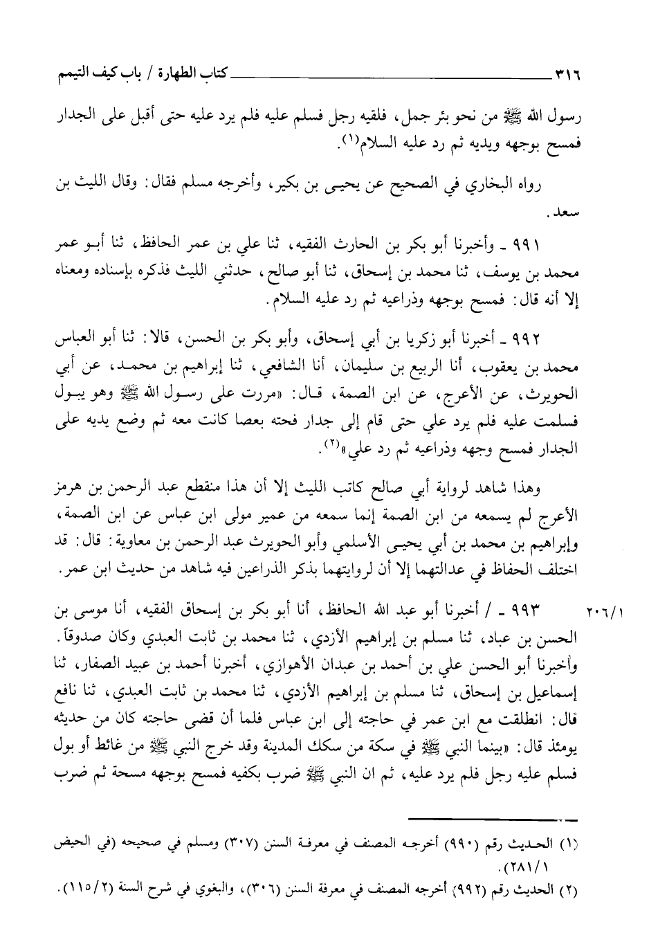 992 - أَخْبَرَنَا أَبُو زَكَرِيَّا بْنُ أَبِي إِسْحَاقَ، وَأَبُو بَكْرِ بْنُ الْحَسَنِ، قَالَا: ثنا أَبُو الْعَبَّاسِ مُحَمَّدُ بْنُ يَعْقُوبَ، أنا الرَّبِيعُ بْنُ سُلَيْمَانَ، أنا الشَّافِعِيُّ، ثنا إِبْرَاهِيمُ بْنُ مُحَمَّدٍ، عَنْ أَبِي الْحُوَيْرِثِ، عَنِ الْأَعْرَجِ، عَنِ ابْنِ الصِّمَّةِ، قَالَ: §" مَرَرْتُ عَلَى رَسُولِ اللهِ صَلَّى اللهُ عَلَيْهِ وَسَلَّمَ وَهُوَ يَبُولُ فَسَلَّمْتُ عَلَيْهِ فَلَمْ يَرُدَّ عَلَيَّ حَتَّى قَامَ إِلَى جِدَارٍ، فَحَتَهُ بِعَصًا كَانَتْ مَعَهُ، ثُمَّ وَضَعَ يَدَيْهِ عَلَى الْجِدَارِ، فَمَسَحَ وَجْهَهُ وَذِرَاعَيْهِ، ثُمَّ رَدَّ عَلَيَّ ". وَهَذَا شَاهِدٌ لِرِوَايَةِ أَبِي صَالِحٍ كَاتَبِ اللَّيْثِ إِلَّا أَنَّ هَذَا مُنْقَطِعٌ عَبْدُ الرَّحْمَنِ بْنُ هُرْمُزٍ الْأَعْرَجُ لَمْ يَسْمَعْهُ مِنَ ابْنِ الصِّمَّةِ، إِنَّمَا سَمِعَهُ مِنْ عُمَيْرٍ مَوْلَى ابْنِ عَبَّاسٍ، عَنِ ابْنِ الصِّمَّةِ، وَإِبْرَاهِيمَ بْنِ مُحَمَّدِ بْنِ أَبِي يَحْيَى الْأَسْلَمِيِّ، وَأَبُو الْحُوَيْرِثِ عَبْدِ الرَّحْمَنِ بْنِ مُعَاوِيَةَ، قَالَ: قَدِ اخْتَلَفَ الْحُفَّاظُ فِي عَدَالَتِهِمَا إِلَّا أَنَّ لِرِوَايَتِهِمَا بِذِكْرِ الذِّرَاعَيْنِ فِيهِ شَاهِدٌ مِنْ حَدِيثِ ابْنِ عُمَرَ