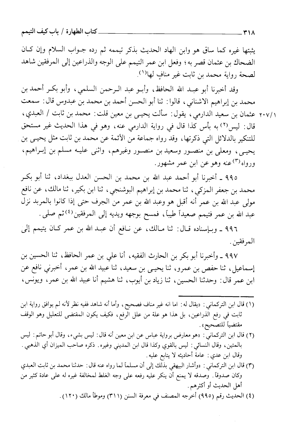 997 - وَأَخْبَرَنَا أَبُو بَكْرِ بْنُ الْحَارِثِ الْفَقِيهُ، أنا عَلِيُّ بْنُ عُمَرَ الْحَافِظُ، ثنا الْحُسَيْنُ بْنُ إِسْمَاعِيلَ، ثنا حَفْصُ بْنُ عَمْرٍو، ثنا يَحْيَى بْنُ سَعِيدٍ، ثنا عُبَيْدُ اللهِ بْنُ عُمَرَ، أَخْبَرَنِي نَافِعٌ، عَنِ ابْنِ عُمَرَ، قَالَ وَحَدَّثَنَا الْحُسَيْنُ، ثنا زِيَادُ بْنُ أَيُّوبَ، ثنا هُشَيْمٌ، أنا عُبَيْدُ اللهِ بْنُ عَمْرَ، وَيُونُسَ، -[319]- عَنْ نَافِعٍ، عَنِ ابْنِ عُمَرَ، أَنَّهُ كَانَ يَقُولُ: §" التَّيَمُّمُ ضَرْبَتَانِ ضَرْبَةٌ لِلْوَجْهِ وَضَرْبَةٌ لِلْكَفَّيْنِ إِلَى الْمِرْفَقَيْنِ ". رَوَاهُ عَلِيُّ بْنُ ظَبْيَانَ، عَنْ عُبَيْدِ اللهِ بْنِ عُمَرَ فَرَفَعَهُ وَهُوَ خَطَأٌ وَالصَّوَابُ بِهَذَا اللَّفْظِ عَنِ ابْنِ عُمَرَ مَوْقُوفٌ. وَرَوَاهُ سُلَيْمَانُ بْنُ أَبِي دَاوُدَ الْحَرَّانِيُّ، عَنْ سَالِمٍ، وَنَافِعٍ، عَنِ ابْنِ عُمَرَ، عَنِ النَّبِيِّ صَلَّى اللهُ عَلَيْهِ وَسَلَّمَ. وَرَوَاهُ سُلَيْمَانُ بْنُ أَرْقَمَ التَّيْمِيُّ، عَنِ الزُّهْرِيِّ، عَنْ سَالِمٍ، عَنْ أَبِيهِ، عَنِ النَّبِيِّ صَلَّى اللهُ عَلَيْهِ وَسَلَّمَ. وَسُلَيْمَانَ بْنِ أَبِي دَاوُدَ وَسُلَيْمَانَ بْنِ أَرْقَمَ ضَعِيفَانِ لَا يُحْتَجُّ بِرِوَايَتِهِمَا وَالصَّحِيحُ رِوَايَةُ مَعْمَرٍ وَغَيْرِهِ، عَنِ الزُّهْرِيِّ، عَنْ سَالِمٍ، عَنِ ابْنِ عُمَرَ مِنْ فِعْلِهِ