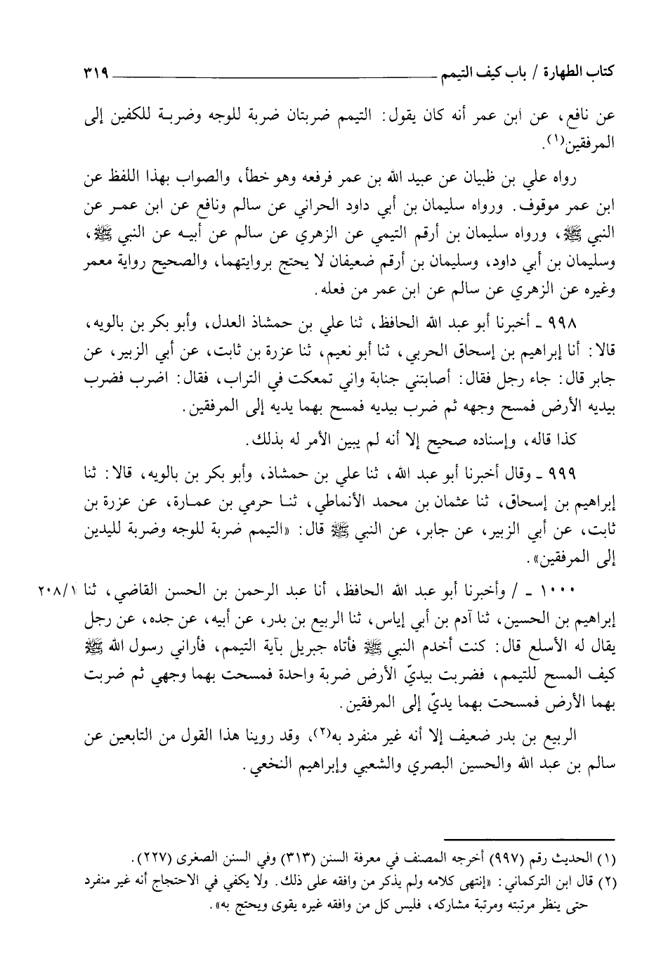 1000 - وَأَخْبَرَنَا أَبُو عَبْدِ اللهِ الْحَافِظُ، أنا عَبْدُ الرَّحْمَنِ بْنُ الْحَسَنِ الْقَاضِي، ثنا إِبْرَاهِيمُ بْنُ الْحُسَيْنِ، ثنا آدَمُ بْنُ أَبِي إِيَاسٍ، ثنا الرَّبِيعُ بْنُ بَدْرٍ، عَنْ أَبِيهِ، عَنْ جَدِّهِ، عَنْ رَجُلٍ يُقَالُ لَهُ الْأَسْلَعُ قَالَ: " كُنْتُ أَخْدُمُ النَّبِيَّ صَلَّى اللهُ عَلَيْهِ وَسَلَّمَ §فَأَتَاهُ جِبْرِيلُ بِآيَةِ التَّيَمُّمِ فَأَرَانِي رَسُولُ اللهِ صَلَّى اللهُ عَلَيْهِ وَسَلَّمَ كَيْفَ الْمَسْحُ لِلتَّيَمُّمِ، فَضَرَبْتُ بِيَدِي الْأَرْضَ ضَرْبَةً وَاحِدَةً فَمَسَحْتُ بِهِمَا وَجْهِي، ثُمَّ ضَرَبْتُ بِهِمَا الْأَرْضَ فَمَسَحْتُ بِهِمَا يَدِيَّ إِلَى الْمِرْفَقَيْنِ " الرَّبِيعُ بْنُ بَدْرٍ ضَعِيفٌ إِلَّا أَنَّهُ غَيْرُ مُنْفَرِدٍ بِهِ وَقَدْ رُوِّينَا هَذَا الْقَوْلَ عَنِ التَّابِعِينَ: عَنْ سَالِمِ بْنِ عَبْدِ اللهِ، وَالْحَسَنِ الْبَصْرِيِّ، وَالشَّعْبِيِّ، وَإِبْرَاهِيمَ النَّخَعِيِّ