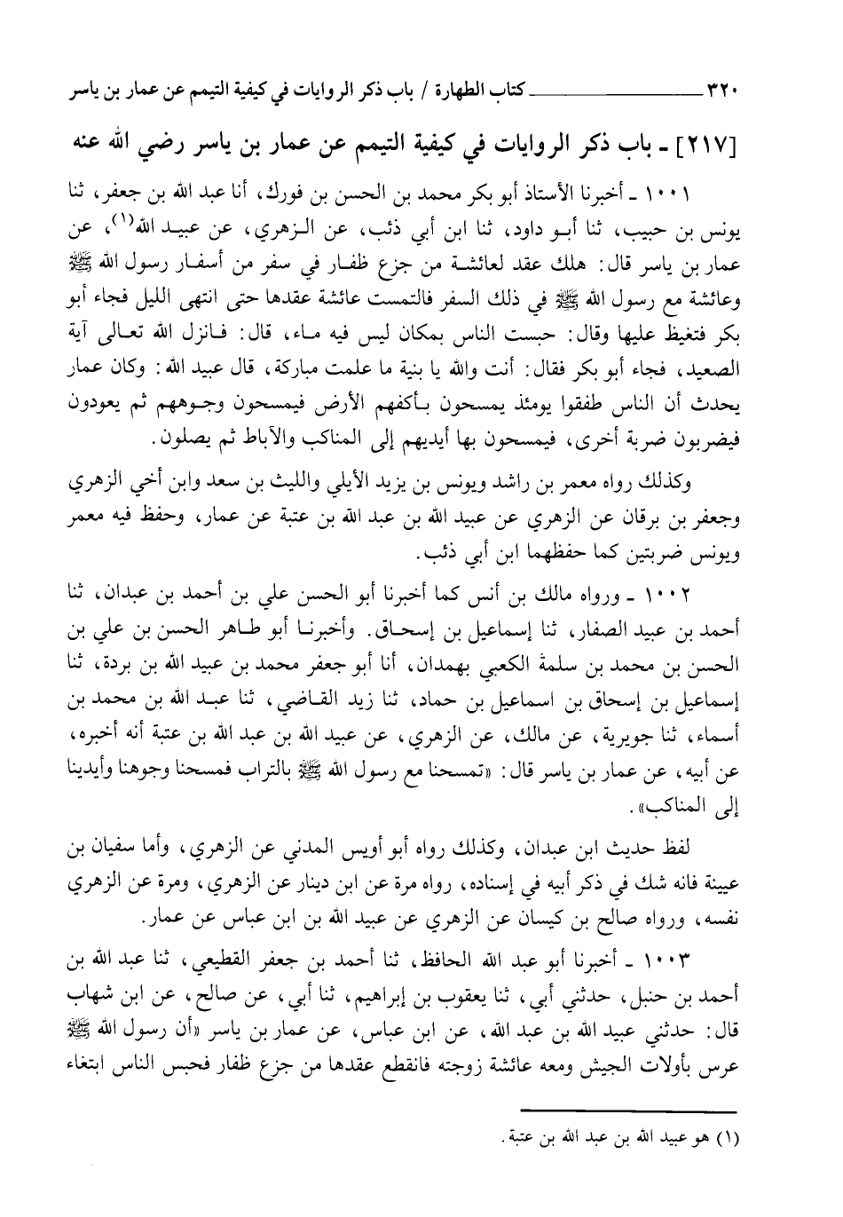 1001 - أَخْبَرَنَا الْأُسْتَاذُ أَبُو بَكْرٍ مُحَمَّدُ بْنُ الْحَسَنِ بْنِ فُورَكٍ، أنا عَبْدُ اللهِ بْنُ جَعْفَرٍ، ثنا يُونُسُ بْنُ حَبِيبٍ، ثنا أَبُو دَاوُدَ، ثنا ابْنُ أَبِي ذِئْبٍ، عَنِ الزُّهْرِيِّ، عَنْ عُبَيْدِ اللهِ، عَنْ عَمَّارِ بْنِ يَاسِرٍ، قَالَ: §" هَلَكَ عِقْدٌ لِعَائِشَةَ مِنْ جَزْعِ ظَفَارٍ فِي سَفَرٍ مِنْ أَسْفَارِ رَسُولِ اللهِ صَلَّى اللهُ عَلَيْهِ وَسَلَّمَ، وَعَائِشَةُ مَعَ رَسُولِ اللهِ صَلَّى اللهُ عَلَيْهِ وَسَلَّمَ فِي ذَلِكَ السَّفَرِ فَالْتَمَسَتْ عَائِشَةُ عِقْدَهَا حَتَّى انْتَهَى اللَّيْلُ، فَجَاءَ أَبُو بَكْرٍ فَتَغَيَّظَ عَلَيْهَا، وَقَالَ: حَبَسْتِ النَّاسَ بِمَكَانٍ لَيْسَ فِيهِ مَاءٌ قَالَ: فَأَنْزَلَ اللهُ تَعَالَى آيَةَ الصَّعِيدِ فَجَاءَ أَبُو بَكْرٍ فَقَالَ: أَنْتِ وَاللهِ يَا بُنَيَّةُ مَا عَلِمْتُ مُبَارَكَةٌ قَالَ عُبَيْدُ اللهِ: وَكَانَ عَمَّارٌ يُحَدِّثُ أَنَّ النَّاسَ طَفِقُوا يَوْمَئِذٍ يَمْسَحُونَ بِأَكُفِّهِمُ الْأَرْضَ، فَيَمْسَحُونَ وُجُوهَهُمْ، ثُمَّ يَعُودُونَ فَيَضْرِبُونَ ضَرْبَةً أُخْرَى فَيَمْسَحُونَ بِهَا أَيْدِيهِمْ إِلَى الْمَنَاكِبِ وَالْآبَاطِ، ثُمَّ يُصَلُّونَ " وَكَذَلِكَ. رَوَاهُ مَعْمَرُ بْنُ رَاشِدٍ، وَيُونُسُ بْنُ يَزِيدَ الْأَيْلِيُّ، وَاللَّيْثُ بْنُ سَعْدٍ وَابْنُ أَخِي الزُّهْرِيِّ، وَجَعْفَرُ بْنُ بُرْقَانَ، عَنِ الزُّهْرِيِّ، عَنْ عُبَيْدِ اللهِ بْنِ عَبْدِ اللهِ بْنِ عُتْبَةَ، عَنْ عَمَّارٍ، وَحَفِظَ فِيهِ مَعْمَرٌ وَيُونُسُ ضَرْبَتَيْنِ كَمَا حَفِظَهُمَا ابْنُ أَبِي ذِئْبٍ