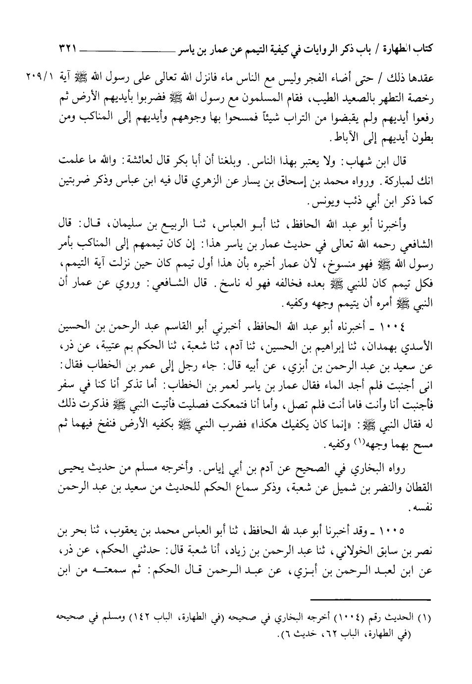 1004 - أَخْبَرَنَاهُ أَبُو عَبْدِ اللهِ الْحَافِظُ، أَخْبَرَنِي أَبُو الْقَاسِمِ عَبْدُ الرَّحْمَنِ بْنُ الْحُسَيْنِ الْأَسَدِيُّ بِهَمَدَانَ، ثنا إِبْرَاهِيمُ بْنُ الْحُسَيْنِ، ثنا آدَمُ، ثنا شُعْبَةُ، ثنا الْحَكَمُ بْنُ عُتَيْبَةَ، عَنْ ذَرٍّ، عَنْ سَعِيدِ بْنِ عَبْدِ الرَّحْمَنِ بْنِ أَبْزَى، عَنْ أَبِيهِ، قَالَ: جَاءَ رَجُلٌ إِلَى عُمَرَ بْنِ الْخَطَّابِ، فَقَالَ: إِنِّي أَجْنَبْتُ فَلَمْ أَجِدِ الْمَاءَ فَقَالَ عَمَّارُ بْنُ يَاسِرٍ لِعُمَرَ بْنِ الْخَطَّابِ أَمَا تَذْكُرُ، أَنَّا كُنَّا فِي سَفَرٍ فَأَجْنَبْتُ، أَنَا وَأَنْتَ فَأَمَّا أَنْتَ فَلَمْ تُصَلِّ، وَأَمَّا أَنَا فَتَمَعَّكْتُ فَصَلَّيْتُ فَأَتَيْتُ النَّبِيَّ صَلَّى اللهُ عَلَيْهِ وَسَلَّمَ فَذَكَرْتُ ذَلِكَ لَهُ فَقَالَ النَّبِيُّ صَلَّى اللهُ عَلَيْهِ وَسَلَّمَ: §" إِنَّمَا كَانَ يَكْفِيكَ هَكَذَا " فَضَرَبَ النَّبِيُّ صَلَّى اللهُ عَلَيْهِ وَسَلَّمَ بِكَفَّيْهِ الْأَرْضَ فَنَفَخَ فِيهِمَا، ثُمَّ مَسَحَ بِهِمَا وَجْهَهُ وَكَفَّيْهِ " رَوَاهُ الْبُخَارِيُّ فِي الصَّحِيحِ عَنْ آدَمَ بْنِ أَبِي إِيَاسٍ وَأَخْرَجَهُ مُسْلِمٌ، مِنْ حَدِيثِ يَحْيَى الْقَطَّانِ، وَالنَّضْرِ بْنِ شُمَيْلٍ، عَنْ شُعْبَةَ وَذَكَرَ سَمَاعَ الْحَكَمِ لِلْحَدِيثِ مِنْ سَعِيدِ بْنِ عَبْدِ الرَّحْمَنِ نَفْسِهِ