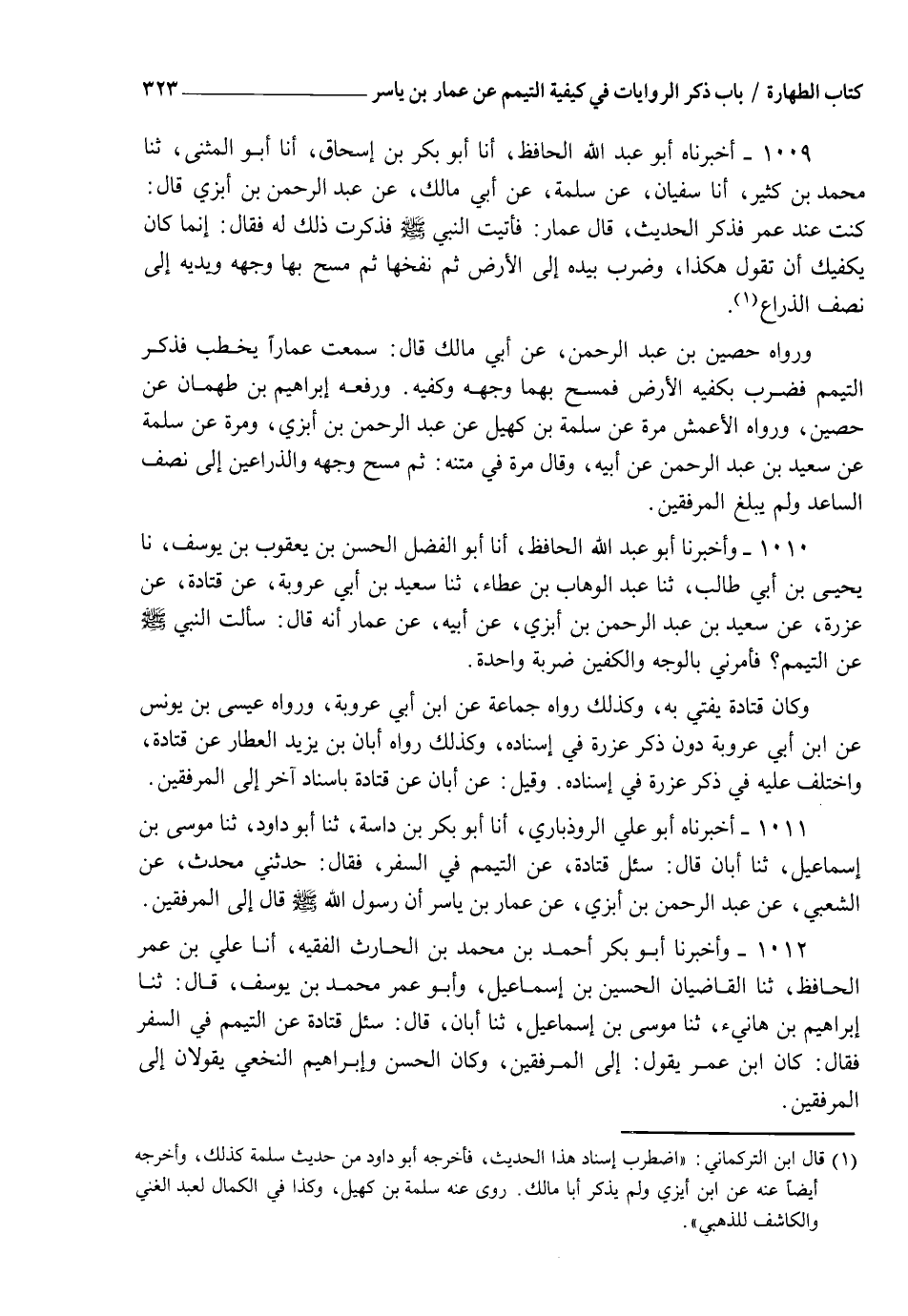1012 - وَأَخْبَرَنَا أَبُو بَكْرٍ أَحْمَدُ بْنُ مُحَمَّدِ بْنِ الْحَارِثِ الْفَقِيهُ، أنا عَلِيُّ بْنُ عُمَرَ الْحَافِظُ، ثنا الْقَاضِيَانِ الْحُسَيْنُ بْنُ إِسْمَاعِيلَ، وَأَبُو عُمَرَ مُحَمَّدُ بْنُ يُوسُفَ، قَالَا: ثنا إِبْرَاهِيمُ بْنُ هَانِئٍ، ثنا مُوسَى بْنُ إِسْمَاعِيلُ، ثنا أَبَانُ، قَالَ: سُئِلَ قَتَادَةُ عَنِ التَّيَمُّمِ فِي السَّفَرِ، فَقَالَ: كَانَ ابْنُ عُمَرَ، يَقُولُ: " §إِلَى الْمِرْفَقَيْنِ "، وَكَانَ الْحَسَنُ وَإِبْرَاهِيمُ النَّخْعِيُّ، يَقُولَانِ: " إِلَى الْمِرْفَقَيْنِ "، -[324]- قَالَ: وَحَدَّثَنِي مُحَدِّثٌ عَنِ الشَّعْبِيِّ، عَنْ عَبْدِ الرَّحْمَنِ بْنِ أَبْزَى، عَنْ عَمَّارِ بْنِ يَاسِرٍ، أَنَّ رَسُولَ اللهِ صَلَّى اللهُ عَلَيْهِ وَسَلَّمَ قَالَ: " إِلَى الْمِرْفَقَيْنِ ". قَالَ أَبُو إِسْحَاقَ: فَذَكَرْتُهُ لِأَحْمَدَ بْنِ حَنْبَلٍ فَعَجِبَ مِنْهُ، وَقَالَ: مَا أَحْسَنْتَ. قَالَ الشَّيْخُ: هَذَا الِاخْتِلَافُ فِي مَتْنِ حَدِيثِ ابْنِ أَبْزَى، عَنْ عَمَّارٍ إِنَّمَا وَقَعَ أَكْثَرُهُ مِنْ سَلَمَةَ بْنِ كُهَيْلٍ لِشَكٍّ وَقَعَ لَهُ وَالْحَكَمُ بْنُ عُتَيْبَةَ فَقِيهٌ حَافِظٌ قَدْ رَوَى عَنْ ذَرِّ بْنِ عَبْدِ اللهِ، عَنْ سَعِيدِ بْنِ عَبْدِ الرَّحْمَنِ، ثُمَّ سَمِعَهُ مِنْ سَعِيدِ بْنِ عَبْدِ الرَّحْمَنِ، فَسَاقَ الْحَدِيثَ عَلَى الْأَثْبَاتِ مِنْ غَيْرِ شَكٍّ فِيهِ وَحَدِيثُ قَتَادَةَ، عَنْ عَزْرَةَ يُوَافِقُهُ، وَكَذَلِكَ حَدِيثُ حُصَيْنٍ، عَنْ أَبِي مَالِكٍ، وَأَمَّا حَدِيثُ قَتَادَةَ، عَنْ مُحَدِّثٍ، عَنِ الشَّعْبِيِّ فَهُوَ مُنْقَطِعٌ لَا يُعْلَمُ مَنِ الَّذِي حَدَّثَهُ فَيُنْظَرُ فِيهِ، وَقَدْ ثَبَتَ الْحَدِيثُ مِنْ وَجْهٍ آخَرَ لَا يَشُكُّ حَدِيثِيُّ فِي صِحَّةِ إِسْنَادِهِ