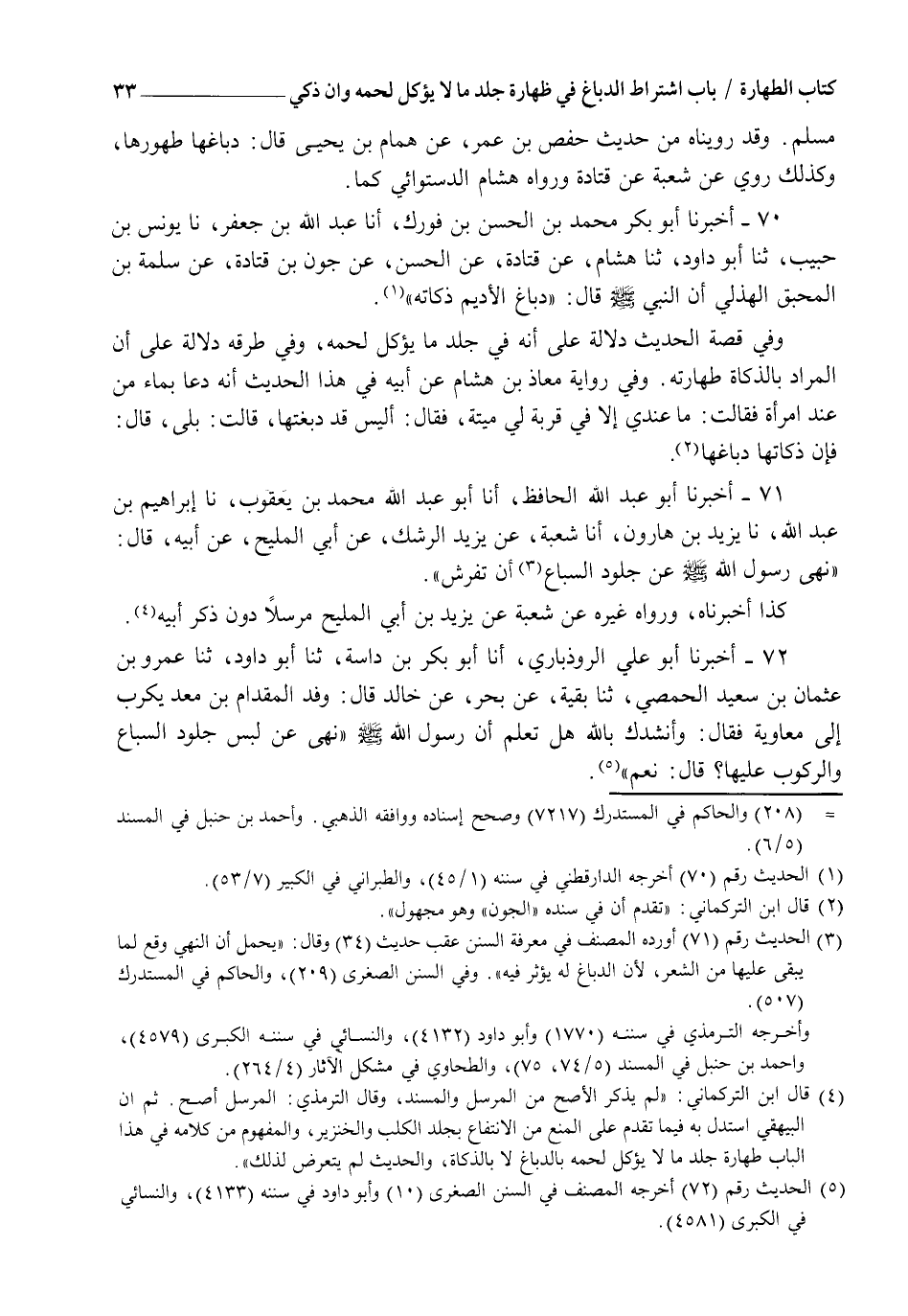 70 - كَمَا أَخْبَرَنَا أَبُو بَكْرٍ مُحَمَّدُ بْنُ الْحَسَنِ بْنِ فُورَكٍ، أنا عَبْدُ اللهِ بْنُ جَعْفَرٍ، نا يُونُسُ بْنُ حَبِيبٍ، ثنا أَبُو دَاوُدَ، ثنا هِشَامٌ، عَنْ قَتَادَةَ، عَنِ الْحَسَنِ، عَنْ جَوْنِ بْنِ قَتَادَةَ، عَنْ سَلَمَةَ بْنِ الْمُحَبِّقِ الْهُذَلِيِّ، أَنَّ النَّبِيَّ صَلَّى اللهُ عَلَيْهِ وَسَلَّمَ، قَالَ: §" دِبَاغُ الْأَدِيمِ ذَكَاتُهُ " وَفِي قِصَّةِ الْحَدِيثِ دَلَالَةٌ عَلَى أَنَّهُ فِي جِلْدِ مَا يُؤْكَلُ لَحْمُهُ. وَفِي طُرُقِهِ دَلَالَةٌ عَلَى أَنَّ الْمُرَادَ بِالذَّكَاةِ طَهَارَتُهُ. وَفِي رِوَايَةِ مُعَاذِ بْنِ هِشَامٍ، عَنْ أَبِيهِ فِي هَذَا الْحَدِيثِ أَنَّهُ دَعَا بِمَاءٍ مِنْ عِنْدِ امْرَأَةٍ فَقَالَتْ: مَا عِنْدِي إِلَّا فِي قِرْبَةٍ لِي مَيِّتَةٍ. فَقَالَ: " أَلَيْسَ قَدْ دَبَغْتِهَا ". قَالَتْ: بَلَى. قَالَ: " فَإِنَّ ذَكَاتَهَا دِبَاغُهَا "