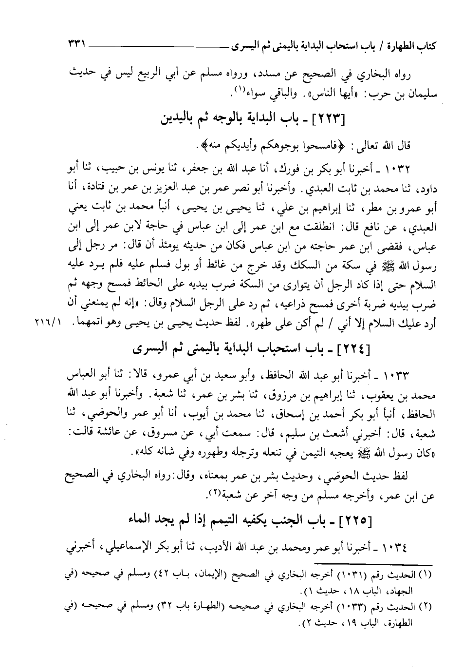 1032 - أَخْبَرَنَا أَبُو بَكْرِ بْنُ فُورَكٍ، أنا عَبْدُ اللهِ بْنُ جَعْفَرٍ، ثنا يُونُسُ بْنُ حَبِيبٍ، ثنا أَبُو دَاوُدَ، ثنا مُحَمَّدُ بْنُ ثَابِتٍ الْعَبْدِيُّ، وَأَخْبَرَنَا أَبُو نَصْرٍ عُمَرُ بْنُ عَبْدِ الْعَزِيزِ بْنِ عُمَرَ بْنِ قَتَادَةَ، أنا أَبُو عَمْرِو بْنُ مَطَرٍ، ثنا إِبْرَاهِيمُ بْنُ عَلِيٍّ، ثنا يَحْيَى بْنُ يَحْيَى، أنبأ مُحَمَّدُ بْنُ ثَابِتٍ يَعْنِي الْعَبْدِيَّ، عَنْ نَافِعٍ، قَالَ: انْطَلَقْتُ مَعَ ابْنِ عُمَرَ إِلَى ابْنِ عَبَّاسٍ فِي حَاجَةٍ لِابْنِ عُمَرَ إِلَى ابْنِ عَبَّاسٍ فَقَضَى ابْنُ عُمَرَ حَاجَتَهُ مِنَ ابْنِ عَبَّاسٍ فَكَانَ مِنْ حَدِيثِهِ يَوْمَئِذٍ أَنْ قَالَ: مَرَّ رَجُلٌ عَلَى رَسُولِ اللهِ صَلَّى اللهُ عَلَيْهِ وَسَلَّمَ فِي سِكَّةٍ مِنَ السِّكَكِ، وَقَدْ خَرَجَ مِنْ غَائِطٍ أَوْ بَوْلٍ فَسَلَّمَ عَلَيْهِ فَلَمْ يَرُدَّ عَلَيْهِ السَّلَامَ، حَتَّى إِذَا كَادَ الرَّجُلُ أَنْ يَتَوَارَى مِنَ السِّكَّةِ ضَرَبَ بِيَدَيْهِ عَلَى الْحَائِطِ فَمَسَحَ وَجْهَهُ، ثُمَّ ضَرَبَ بِيَدَيْهِ ضَرْبَةً أُخْرَى فَمَسَحَ ذِرَاعَيْهِ، ثُمَّ رَدَّ عَلَى الرَّجُلِ السَّلَامَ وَقَالَ: " إِنَّهُ §لَمْ يَمْنَعْنِي أَنْ أَرُدَّ عَلَيْكَ السَّلَامَ إِلَّا أَنِّي لَمْ أَكُنْ عَلَى طُهْرٍ ". لَفْظُ حَدِيثِ يَحْيَى بْنِ يَحْيَى، وَهُوَ أَتَمُّهُمَا