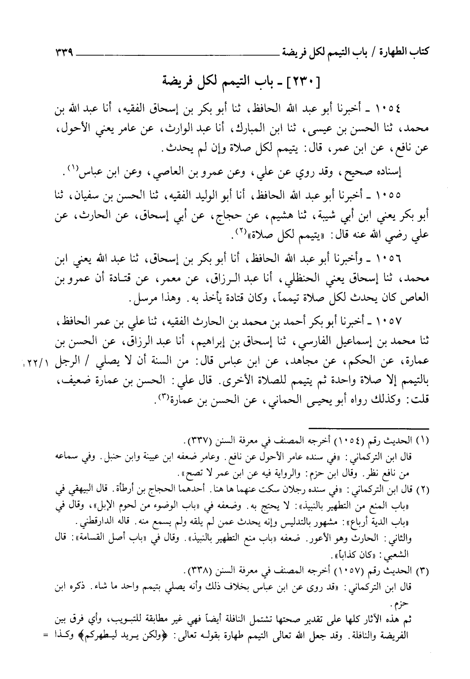 1054 - أَخْبَرَنَا أَبُو عَبْدِ اللهِ الْحَافِظُ، ثنا أَبُو بَكْرِ بْنُ إِسْحَاقَ الْفَقِيهُ، أنا عَبْدُ اللهِ بْنُ مُحَمَّدٍ، ثنا الْحَسَنُ بْنُ عِيسَى، ثنا ابْنُ الْمُبَارَكِ، أنا عَبْدُ الْوَارِثِ، عَنْ عَامِرٍ يَعْنِي الْأَحْوَلَ، عَنْ نَافِعٍ، عَنِ ابْنِ عُمَرَ، قَالَ: §" يَتَيَمَّمُ لِكُلِّ صَلَاةٍ وَإِنْ لَمْ يُحْدِثْ " إِسْنَادُهُ صَحِيحٌ وَقَدْ رُوِيَ عَنْ عَلِيٍّ وَعَنْ عَمْرِو بْنِ الْعَاصِ وَعَنِ ابْنِ عَبَّاسٍ
