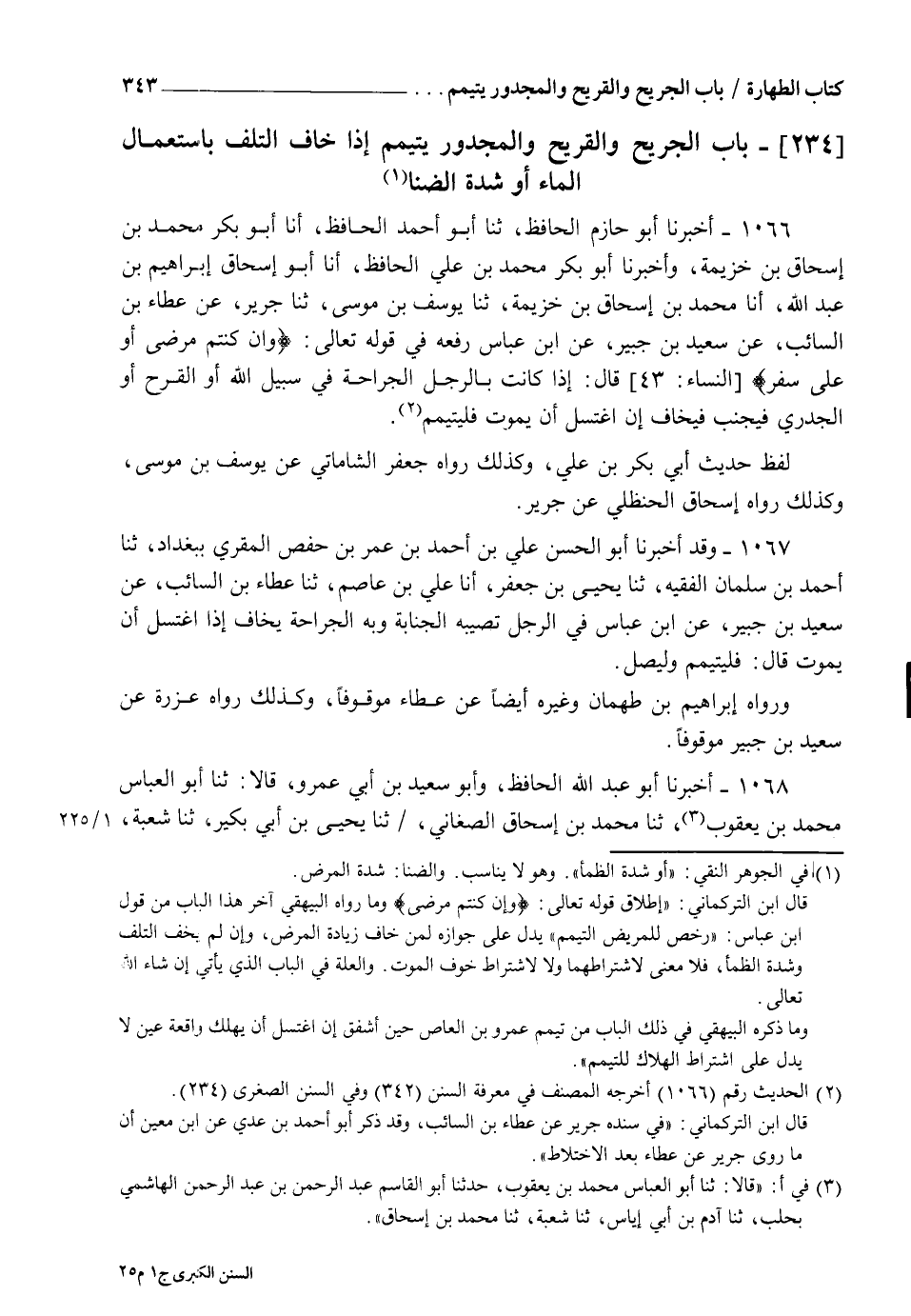 1066 - أَخْبَرَنَا أَبُو حَازِمٍ الْحَافِظُ، ثنا أَبُو أَحْمَدَ الْحَافِظُ، أنا أَبُو بَكْرٍ مُحَمَّدُ بْنُ إِسْحَاقَ بْنِ خُزَيْمَةَ وَأَخْبَرَنَا أَبُو بَكْرٍ أَحْمَدُ بْنُ عَلِيٍّ الْحَافِظُ أنا أَبُو إِسْحَاقَ إِبْرَاهِيمُ بْنُ عَبْدِ اللهِ أنا مُحَمَّدُ بْنُ إِسْحَاقَ بْنِ خُزَيْمَةَ، ثنا يُوسُفُ بْنُ مُوسَى، ثنا جَرِيرُ، عَنْ عَطَاءِ بْنِ السَّائِبِ، عَنْ سَعِيدِ بْنِ جُبَيْرٍ، عَنِ ابْنِ عَبَّاسٍ، رَفَعَهُ فِي قَوْلِهِ تَعَالَى {وَإِنْ كُنْتُمْ مَرْضَى أَوْ عَلَى سَفَرٍ} [النساء: 43] قَالَ: §" إِذَا كَانَتْ بِالرَّجُلِ الْجِرَاحَةُ فِي سَبِيلِ اللهِ أَوِ الْقَرْحُ أَوِ الْجُدَرِيُّ فَيُجْنِبُ فَيَخَافُ إِنِ اغْتَسَلَ أَنْ يَمُوتَ فَلْيَتَيَمَّمْ. لَفْظُ حَدِيثِ أَبِي بَكْرِ بْنِ عَلِيٍّ، وَكَذَلِكَ رَوَاهُ جَعْفَرٌ الشَّامَاتِيُّ، عَنْ يُوسُفَ بْنِ مُوسَى، وَكَذَلِكَ رَوَاهُ إِسْحَاقُ الْحَنْظَلِيُّ، عَنْ جَرِيرٍ