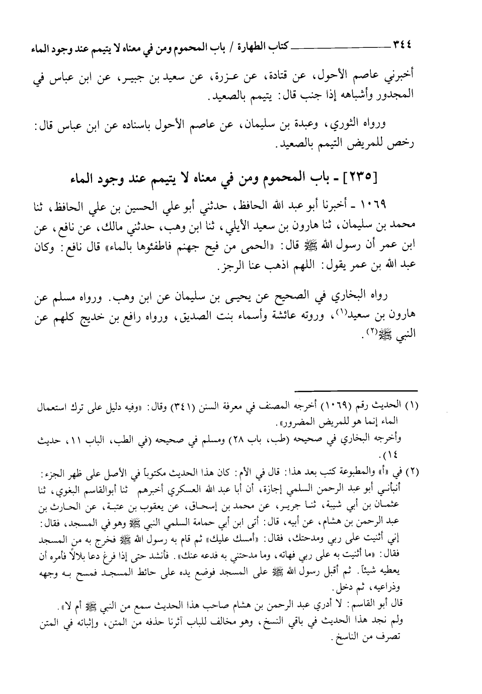 1069 - أَخْبَرَنَا أَبُو عَبْدِ اللهِ الْحَافِظُ، حَدَّثَنِي أَبُو عَلِيٍّ الْحُسَيْنُ بْنُ عَلِيٍّ الْحَافِظُ، ثنا مُحَمَّدُ بْنُ سُلَيْمَانَ، ثنا هَارُونُ بْنُ سَعِيدٍ الْأَيْلِيُّ، ثنا ابْنُ وَهْبٍ، حَدَّثَنِي مَالِكٌ، عَنْ نَافِعٍ، عَنِ ابْنِ عُمَرَ، أَنَّ رَسُولَ اللهِ صَلَّى اللهُ عَلَيْهِ وَسَلَّمَ قَالَ: " §الْحُمَّى مِنْ فَيْحِ جَهَنَّمَ فَأَطْفِئُوهَا بِالْمَاءِ " قَالَ نَافِعٌ: وَكَانَ عَبْدُ اللهِ بْنُ عُمَرَ يَقُولُ: اللهُمَّ أَذْهِبْ عَنَّا الرِّجْزَ " رَوَاهُ الْبُخَارِيُّ فِي الصَّحِيحِ عَنْ يَحْيَى بْنِ سُلَيْمَانَ، عَنِ ابْنِ وَهْبٍ، وَرَوَاهُ مُسْلِمٌ عَنْ هَارُونَ بْنِ سَعِيدٍ وَرَوَتْهُ عَائِشَةُ وَأَسْمَاءُ بِنْتُ الصِّدِّيقِ، وَرَوَاهُ رَافِعُ بْنُ خَدِيجٍ كُلُّهُمْ عَنِ النَّبِيِّ صَلَّى اللهُ عَلَيْهِ وَسَلَّمَ