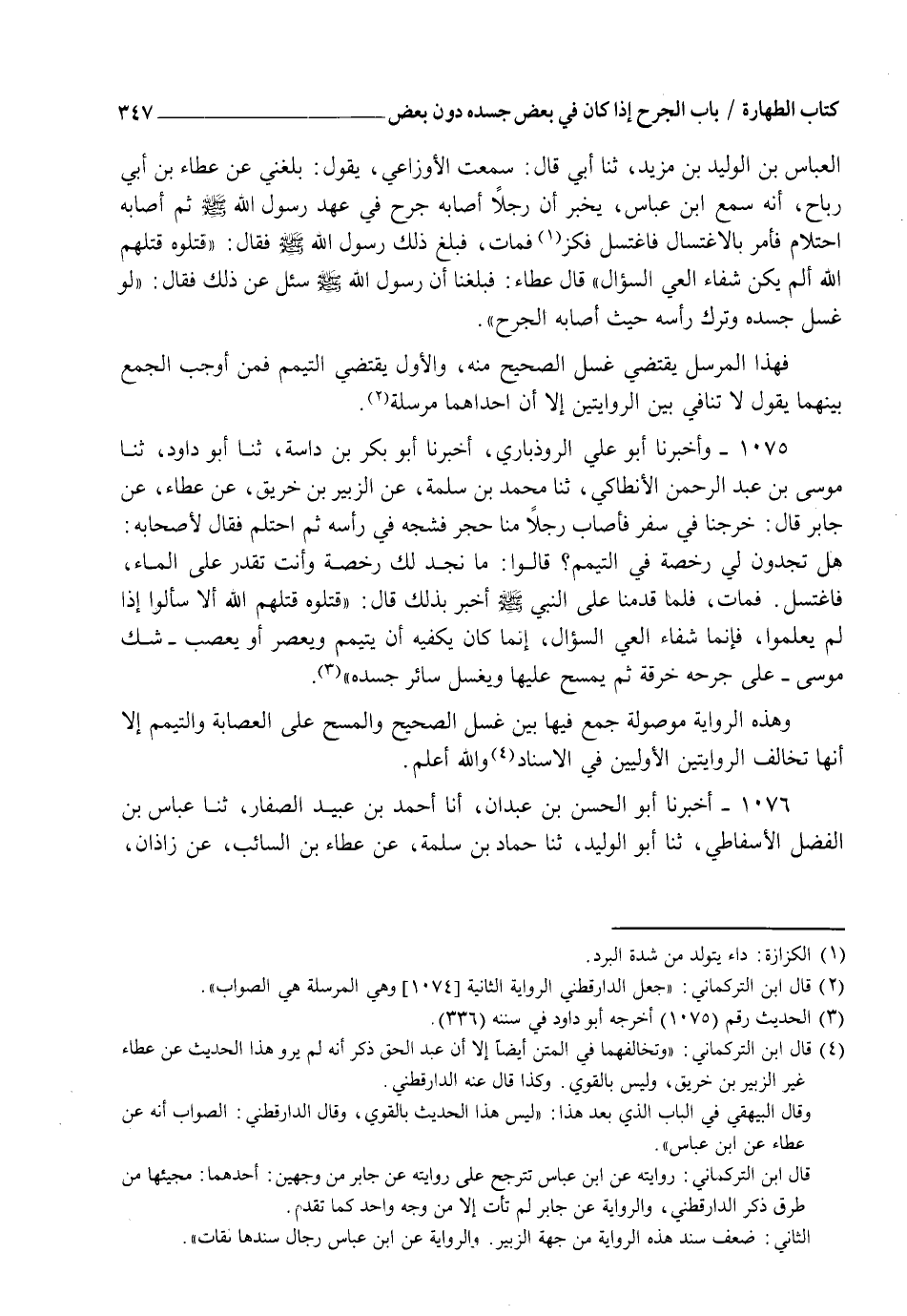 1075 - وَأَخْبَرَنَا أَبُو عَلِيٍّ الرُّوذْبَارِيُّ، أَخْبَرَنَا أَبُو بَكْرِ بْنُ دَاسَةَ، ثنا أَبُو دَاوُدَ، ثنا مُوسَى بْنُ عَبْدِ الرَّحْمَنِ الْأَنْطَاكِيُّ، ثنا مُحَمَّدُ بْنُ سَلَمَةَ، عَنِ الزُّبَيْرِ بْنِ خُرَيْقٍ، عَنْ عَطَاءٍ، عَنْ جَابِرٍ، قَالَ: خَرَجْنَا فِي سَفَرٍ فَأَصَابَ رَجُلًا مَنْا حَجَرٌ فَشَجَّهُ فِي رَأْسِهِ، ثُمَّ احْتَلَمَ، فَقَالَ لِأَصْحَابِهِ: هَلْ تَجِدُونَ لِي رُخْصَةً فِي التَّيَمُّمِ؟ قَالُوا: مَا نَجِدُ لَكَ رُخْصَةً وَأَنْتَ تَقْدِرُ عَلَى الْمَاءِ، فَاغْتَسَلَ فَمَاتَ فَلَمَّا قَدِمْنَا عَلَى النَّبِيِّ صَلَّى اللهُ عَلَيْهِ وَسَلَّمَ أُخْبِرَ بِذَلِكَ، قَالَ: §" قَتَلُوهُ قَتَلَهُمُ اللهُ أَلَا سَأَلُوا إِذْ لَمْ يَعْلَمُوا فَإِنَّمَا شِفَاءُ الْعِيِّ السُّؤَالُ إِنَّمَا كَانَ يَكْفِيهِ أَنْ يَتَيَمَّمَ وَيَعْصِرَ - أَوْ يَعْصِبَ شَكَّ مُوسَى - عَلَى جُرْحِهِ خِرْقَةً، ثُمَّ يَمْسَحُ عَلَيْهَا وَيَغْسِلُ سَائِرَ جَسَدِهِ ". وَهَذِهِ الرِّوَايَةُ مَوْصُولَةٌ جُمِعَ فِيهَا بَيْنَ غُسْلِ الصَّحِيحِ وَالْمَسْحِ عَلَى الْعِصَابَةِ وَالتَّيَمُّمِ إِلَّا إِنَّهَا تُخَالِفُ الرِّوَايَتَيْنِ الْأُولَيَيْنِ فِي الْإِسْنَادِ، وَاللهُ أَعْلَمُ