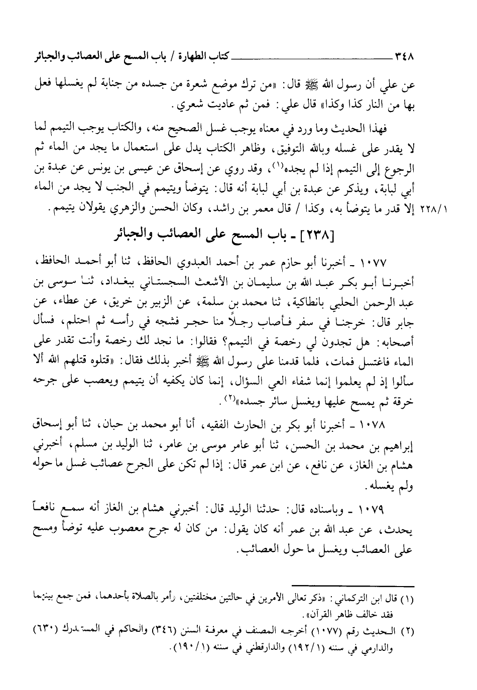1078 - أَخْبَرَنَا أَبُو بَكْرِ بْنُ الْحَارِثِ الْفَقِيهُ، أنا أَبُو مُحَمَّدِ بْنُ حَيَّانَ، ثنا أَبُو إِسْحَاقَ إِبْرَاهِيمُ بْنُ مُحَمَّدِ بْنِ الْحَسَنِ، ثنا أَبُو عَامِرٍ مُوسَى بْنُ عَامِرٍ، ثنا الْوَلِيدُ بْنُ مُسْلِمٍ، أَخْبَرَنِي هِشَامُ بْنُ الْغَازِ، عَنْ نَافِعٍ، عَنِ ابْنِ عُمَرَ، قَالَ: " §إِذَا لَمْ تَكُنْ عَلَى الْجُرْحِ عَصَائِبُ غَسَلَ مَا حَوْلَهُ، وَلَمْ يَغْسِلْهُ ".