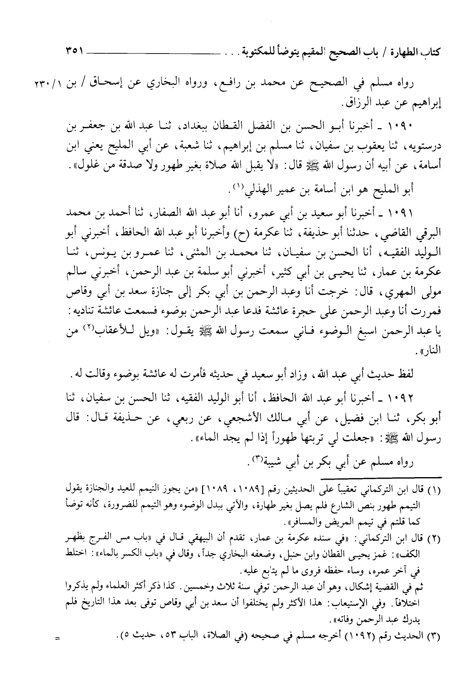 1091 - أَخْبَرَنَا أَبُو سَعِيدِ بْنُ أَبِي عَمْرٍو، أنا أَبُو عَبْدِ اللهِ الصَّفَّارُ، ثنا أَحْمَدُ بْنُ مُحَمَّدٍ الْبَرْقِيُّ الْقَاضِي، حَدَّثَنَا أَبُو حُذَيْفَةَ، ثنا عِكْرِمَةُ، ح. وَأَخْبَرَنَا أَبُو عَبْدِ اللهِ الْحَافِظُ، أَخْبَرَنِي أَبُو الْوَلِيدِ الْفَقِيهُ، أنا الْحَسَنُ بْنُ سُفْيَانَ، ثنا مُحَمَّدُ بْنُ الْمُثَنَّى، ثنا عَمْرُو بْنُ يُونُسَ، ثنا عِكْرِمَةُ بْنُ عَمَّارٍ، ثنا يَحْيَى بْنُ أَبِي كَثِيرٍ، أَخْبَرَنِي أَبُو سَلَمَةَ بْنُ عَبْدِ الرَّحْمَنِ، أَخْبَرَنِي سَالِمٌ مَوْلَى الْمَهْرِيِّ، قَالَ: خَرَجْتُ أنا وَعَبْدُ الرَّحْمَنِ بْنُ أَبِي بَكْرٍ إِلَى جَنَازَةِ سَعْدِ بْنِ أَبِي وَقَّاصٍ فَمَرَرْتُ أَنَا وَعَبْدُ الرَّحْمَنِ عَلَى حُجْرَةِ عَائِشَةَ فَدَعَا عَبْدُ الرَّحْمَنِ بِوَضُوءٍ فَسَمِعْتُ عَائِشَةَ تُنَادِيهِ: يَا عَبْدَ الرَّحْمَنِ أَسْبِغِ الْوُضُوءَ فَإِنِّي سَمِعْتُ رَسُولَ اللهِ صَلَّى اللهُ عَلَيْهِ وَسَلَّمَ يَقُولُ: §" وَيْلٌ لِلْأَعْقَابِ مَنَ النَّارِ " لَفْظُ حَدِيثِ أَبِي عَبْدِ اللهِ وَزَادَ أَبُو سَعِيدٍ فِي حَدِيثِهِ فَأَمَرَتْ لَهُ عَائِشَةُ بِوَضُوءٍ وَقَالَتْ لَهُ
