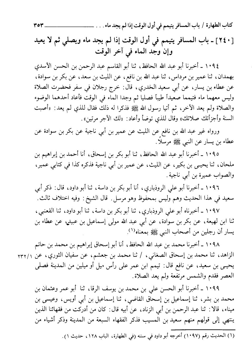 1094 - أَخْبَرَنَا أَبُو عَبْدِ اللهِ الْحَافِظُ، ثنا أَبُو الْقَاسِمِ عَبْدُ الرَّحْمَنِ بْنُ الْحَسَنِ الْأَسَدِيُّ بِهَمَدَانَ، ثنا عُمَيْرُ بْنُ مِرْدَاسٍ، ثنا عَبْدُ اللهِ بْنُ نَافِعٍ، عَنِ اللَّيْثِ بْنِ سَعْدٍ، عَنْ بَكْرِ بْنِ سَوَادَةَ، عَنْ عَطَاءِ بْنِ يَسَارٍ، عَنْ أَبِي سَعِيدٍ الْخُدْرِيِّ، قَالَ: خَرَجَ رَجُلَانِ فِي سَفَرٍ فَحَضَرَتِ الصَّلَاةُ وَلَيْسَ مَعَهُمَا مَاءٌ فَتَيَمَّمَا صَعِيدًا طَيِّبًا فَصَلَّيَا، ثُمَّ وَجَدَا الْمَاءَ فِي الْوَقْتِ فَأَعَادَ أَحَدُهُمَا الْوُضُوءَ وَالصَّلَاةَ وَلَمْ يُعِدِ الْآخَرُ، ثُمَّ أَتَيَا رَسُولَ اللهِ صَلَّى اللهُ عَلَيْهِ وَسَلَّمَ فَذَكَرَا لَهُ ذَلِكَ، فَقَالَ §لِلَّذِي لَمْ يُعِدْ: " أَصَبْتَ السُّنَّةَ وَأَجْزَأَتْكَ صَلَاتُكَ " وَقَالَ لِلَّذِي تَوَضَّأَ وَأَعَادَ: " لَكَ الْأَجْرُ مَرَّتَيْنِ " وَرَوَاهُ غَيْرُ عَبْدِ اللهِ بْنِ نَافِعٍ، عَنِ اللَّيْثِ، عَنْ عُمَيْرِ بْنِ أَبِي نَاجِيَةَ، عَنْ بَكْرِ بْنِ سَوَادَةَ، عَنْ عَطَاءِ بْنِ يَسَارٍ، عَنِ النَّبِيِّ صَلَّى اللهُ عَلَيْهِ وَسَلَّمَ مُرْسَلًا