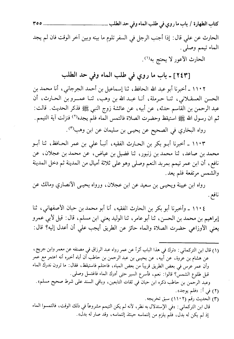 1104 - وأَخْبَرَنَا أَبُو بَكْرِ بْنُ الْحَارِثِ الْفَقِيهُ، أنا أَبُو مُحَمَّدِ بْنُ حِبَّانَ الْأَصْفَهَانِيُّ، ثنا إِبْرَاهِيمُ بْنُ مُحَمَّدِ بْنِ الْحَسَنِ، ثنا أَبُو عَامِرٍ، ثنا الْوَلِيدُ يَعْنِي ابْنَ مُسْلِمٍ، قَالَ: قِيلَ لِأَبِي عَمْرٍو يَعْنِي الْأَوْزَاعِيَّ: حَضَرَتِ الصَّلَاةُ وَالْمَاءُ حَائِزٌ عَنِ الطَّرِيقِ أَيَجِبُ عَلَيَّ أَنْ أَعْدِلَ إِلَيْهِ، قَالَ: -[356]- حَدَّثَنِي مُوسَى بْنُ يَسَارٍ، عَنْ نَافِعٍ، عَنِ ابْنِ عُمَرَ أَنَّهُ كَانَ §يَكُونُ فِي السَّفَرِ فَتَحْضُرُهُ الصَّلَاةُ وَالْمَاءُ مَنْهُ عَلَى غَلْوَةٍ أَوْ غَلْوَتَيْنِ وَنَحْوِ ذَلِكَ، ثُمَّ لَا يَعْدِلُ إِلَيْهِ "