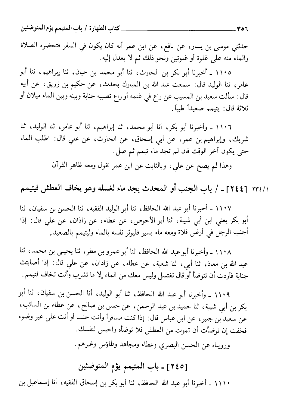 1109 - وَأَخْبَرَنَا أَبُو عَبْدِ اللهِ الْحَافِظُ، ثنا أَبُو الْوَلِيدِ، أنا الْحَسَنُ بْنُ سُفْيَانَ، ثنا أَبُو بَكْرِ بْنُ أَبِي شَيْبَةَ، ثنا حُمَيْدُ بْنُ عَبْدِ الرَّحْمَنِ، عَنْ حَسَنِ بْنِ صَالِحٍ، عَنْ عَطَاءِ بْنِ السَّائِبِ، عَنْ سَعِيدِ بْنِ جُبَيْرٍ، عَنِ ابْنِ عَبَّاسٍ، قَالَ: §" إِذَا كُنْتَ مُسَافِرًا وَأَنْتَ جُنُبٌ أَوْ أَنْتَ عَلَى غَيْرِ وُضُوءٍ فَخِفْتَ إِنْ تَوَضَّأْتَ أَنْ تَمُوتَ مَنَ الْعَطَشِ فَلَا تَوَضَّأْهُ وَاحْبِسْ لِنَفْسِكَ " وَرُوِّينَاهُ عَنِ الْحَسَنِ الْبَصْرِيِّ وَعَطَاءٍ وَمُجَاهِدٍ وَطَاوُسٍ وَغَيْرِهِمْ