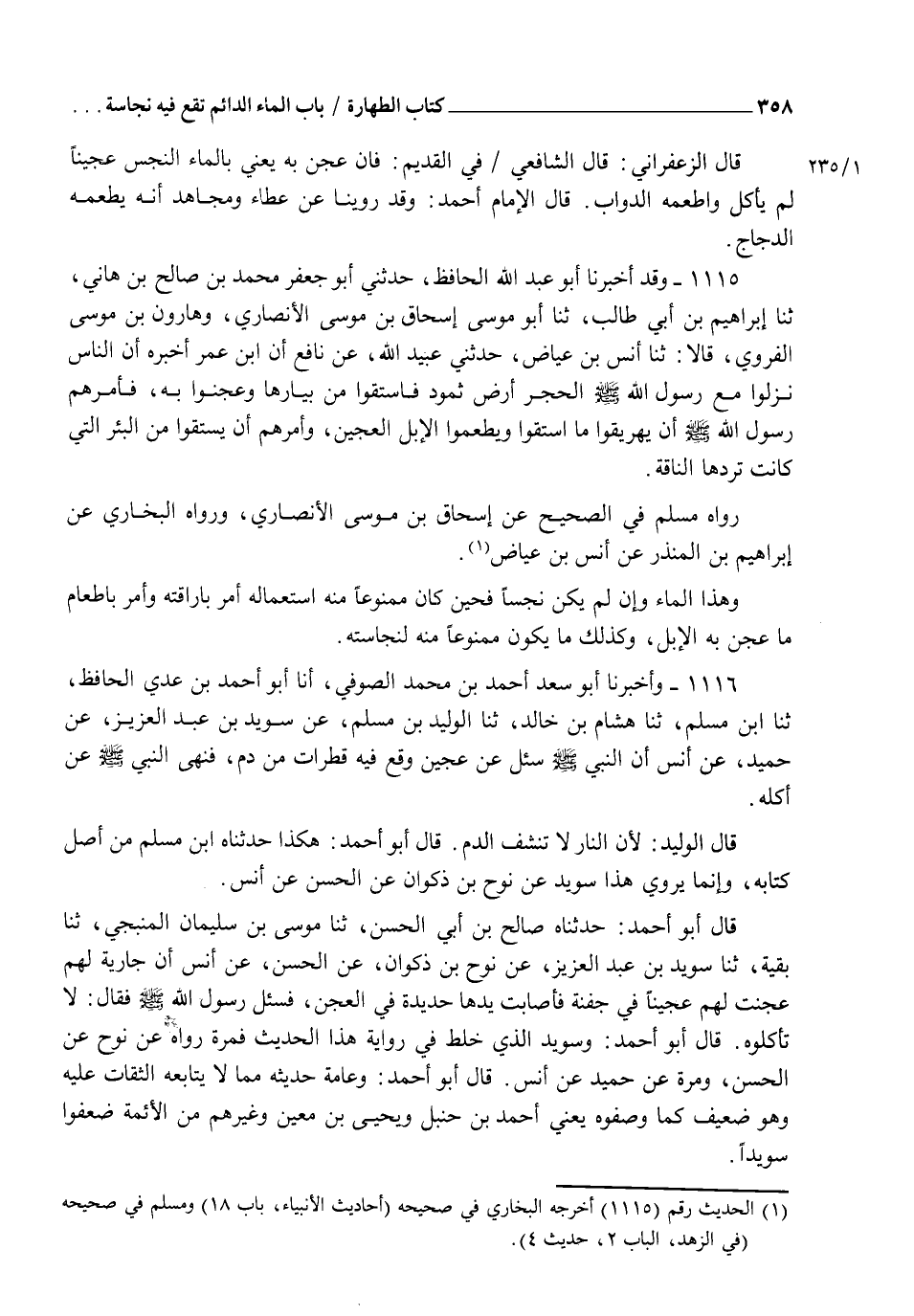 1115 - وَقَدْ أَخْبَرَنَا أَبُو عَبْدِ اللهِ الْحَافِظُ، حَدَّثَنِي أَبُو جَعْفَرٍ مُحَمَّدُ بْنُ صَالِحِ بْنِ هَانِئٍ، ثنا إِبْرَاهِيمُ بْنُ أَبِي طَالِبٍ، ثنا أَبُو مُوسَى إِسْحَاقُ بْنُ مُوسَى الْأَنْصَارِيُّ وَهَارُونُ بْنُ مُوسَى الْفَرْوِيُّ قَالَا: ثنا أَنَسُ بْنُ عِيَاضٍ، حَدَّثَنِي عُبَيْدُ اللهِ، عَنْ نَافِعٍ، أَنَّ ابْنَ عُمَرَ، أَخْبَرَهُ أَنَّ النَّاسَ نَزَلُوا مَعَ رَسُولِ اللهِ صَلَّى اللهُ عَلَيْهِ وَسَلَّمَ الْحِجْرَ أَرْضَ ثَمُودٍ فَاسْتَقَوْا مِنْ بِيَارِهَا وَعَجَنُوا بِهِ فَأَمَرَهُمْ رَسُولُ اللهِ صَلَّى اللهُ عَلَيْهِ وَسَلَّمَ أَنْ §يُهَرِيقُوا مَا اسْتَقَوْا وَيُطْعِمُوا الْإِبِلَ الْعَجِينَ وَأَمَرَهُمْ أَنْ يَسْتَقُوا مَنَ الْبِئْرِ الَّتِي كَانَتْ تَرِدُهَا النَّاقَةُ " رَوَاهُ مُسْلِمٌ فِي الصَّحِيحِ عَنْ إِسْحَاقَ بْنِ مُوسَى الْأَنْصَارِيِّ وَرَوَاهُ الْبُخَارِيُّ عَنْ إِبْرَاهِيمَ بْنِ الْمُنْذِرِ، عَنْ أَنَسِ بْنِ عِيَاضٍ وَهَذَا الْمَاءُ وَإِنْ لَمْ يَكُنْ نَجِسًا فَحِينَ كَانَ مَمْنُوعًا مَنْهُ اسْتِعْمَالُهُ أَمَرَ بِإِرَاقَتِهِ وَأَمَرَ بِإِطْعَامِ مَا عُجِنَ بِهِ الْإِبِلَ وَكَذَلِكَ مَا يَكُونُ مَمْنُوعًا مَنْهُ لِنَجَاسَتِهِ
