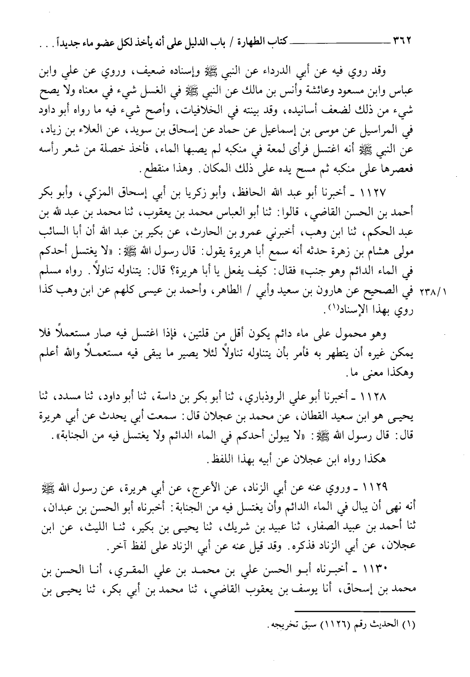 1127 - أَخْبَرَنَا أَبُو عَبْدِ اللهِ الْحَافِظُ، وَأَبُو زَكَرِيَّا بْنُ أَبِي إِسْحَاقَ الْمُزَكِّي وَأَبُو بَكْرٍ أَحْمَدُ بْنُ الْحَسَنِ الْقَاضِي قَالُوا: ثنا أَبُو الْعَبَّاسِ مُحَمَّدُ بْنُ يَعْقُوبَ، ثنا مُحَمَّدُ بْنُ عَبْدِ اللهِ بْنِ عَبْدِ الْحَكَمِ، ثنا ابْنُ وَهْبٍ، أَخْبَرَنِي عَمْرُو بْنُ الْحَارِثِ، عَنْ بُكَيْرِ بْنِ عَبْدِ اللهِ، أَنَّ أَبَا السَّائِبِ مَوْلَى هِشَامِ بْنِ زُهْرَةَ حَدَّثَهُ أَنَّهُ سَمِعَ أَبَا هُرَيْرَةَ، يَقُولُ: قَالَ رَسُولُ اللهِ صَلَّى اللهُ عَلَيْهِ وَسَلَّمَ: §" لَا يَغْتَسِلْ أَحَدُكُمْ فِي الْمَاءِ الدَّائِمِ وَهُوَ جُنُبٌ ". فَقَالَ: كَيْفَ يَفْعَلُ يَا أَبَا هُرَيْرَةَ؟ قَالَ: يَتَنَاوَلُهُ تَنَاوُلًا رَوَاهُ مُسْلِمٌ فِي الصَّحِيحِ عَنْ هَارُونَ بْنِ سَعِيدٍ وَأَبِي الطَّاهِرِ وَأَحْمَدَ بْنِ عِيسَى كُلُّهُمْ عَنِ ابْنِ وَهْبٍ كَذَا رُوِيَ بِهَذَا الْإِسْنَادِ وَهُوَ مَحْمُولٌ عَلَى مَاءٍ دَائِمٍ يَكُونُ أَقَلَّ مِنْ قُلَّتَيْنِ فَإِذَا اغْتَسَلَ فِيهِ صَارَ مُسْتَعْمَلًا فَلَا يُمَكِّنُ غَيْرَهُ أَنْ يَتَطَهَّرَ بِهِ فَأَمَرَ بِأَنْ يَتَنَاوَلَهُ تَنَاوُلًا لِئَلَّا يَصِيرَ مَا يَبْقَى فِيهِ مُسْتَعْمَلًا، وَاللهُ أَعْلَمُ وَهَكَذَا مَعْنَى مَا