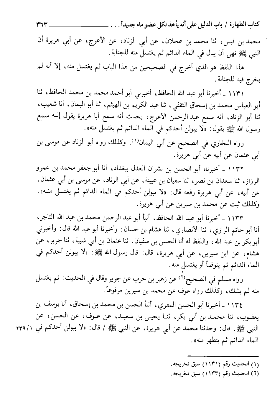 1131 - أَخْبَرَنَا أَبُو عَبْدِ اللهِ الْحَافِظُ، أَخْبَرَنِي أَبُو أَحْمَدَ مُحَمَّدِ بْنِ مُحَمَّدٍ الْحَافِظُ ثنا أَبُو الْعَبَّاسِ مُحَمَّدُ بْنُ إِسْحَاقَ الثَّقَفِيُّ، ثنا عَبْدُ الْكَرِيمِ بْنِ الْهَيْثَمِ، ثنا أَبُو الْيَمَانِ، أنا شُعَيْبٌ، ثنا أَبُو الزِّنَادِ، أَنَّهُ سَمِعَ عَبْدَ الرَّحْمَنِ الْأَعْرَجَ، يُحَدِّثُ أَنَّهُ سَمِعَ أَبَا هُرَيْرَةَ، يَقُولُ: أَنَّهُ سَمِعَ رَسُولَ اللهِ صَلَّى اللهُ عَلَيْهِ وَسَلَّمَ يَقُولُ: §" لَا يَبُولَنَّ أَحَدُكُمْ فِي الْمَاءِ الدَّائِمِ ثُمَّ يَغْتَسِلُ مَنْهُ " رَوَاهُ الْبُخَارِيُّ فِي الصَّحِيحِ عَنْ أَبِي الْيَمَانِ وَكَذَلِكَ رَوَاهُ أَبُو الزِّنَادِ، عَنْ مُوسَى بْنِ أَبِي عُثْمَانَ، عَنْ أَبِيهِ، عَنْ أَبِي هُرَيْرَةَ