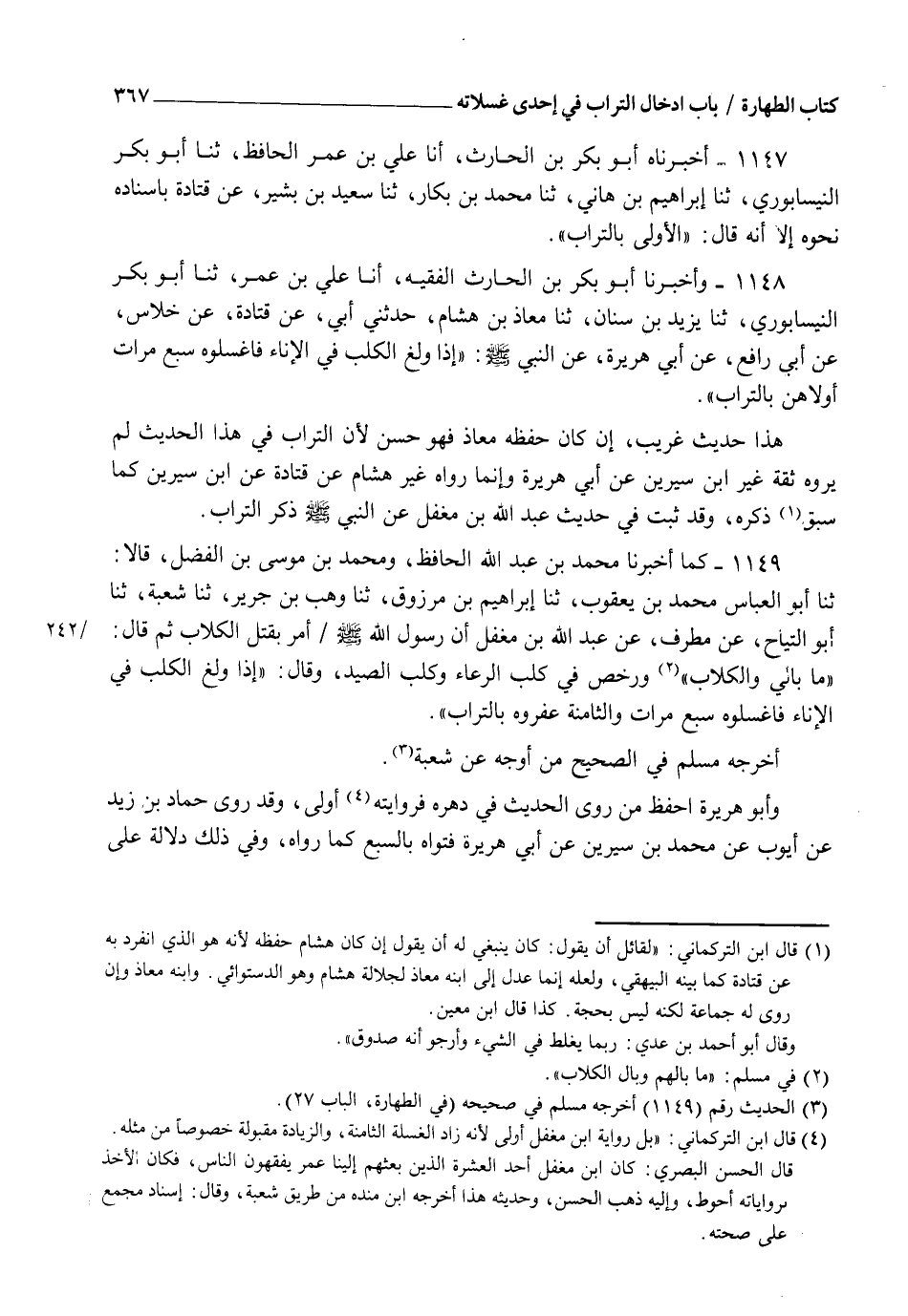 1148 - وَأَخْبَرَنَا أَبُو بَكْرِ بْنُ الْحَارِثِ الْفَقِيهُ، أنا عَلِيُّ بْنُ عُمَرَ، ثنا أَبُو بَكْرٍ النَّيْسَابُورِيُّ، ثنا يَزِيدُ بْنُ سِنَانٍ، ثنا مُعَاذُ بْنُ هِشَامٍ، حَدَّثَنِي أَبِي، عَنْ قَتَادَةَ، عَنْ خِلَاسٍ، عَنْ أَبِي رَافِعٍ، عَنْ أَبِي هُرَيْرَةَ، عَنِ النَّبِيِّ صَلَّى اللهُ عَلَيْهِ وَسَلَّمَ: §" إِذَا وَلَغَ الْكَلْبُ فِي الْإِنَاءِ فَاغْسِلُوهُ سَبْعَ مَرَّاتٍ أُولَاهُنَّ بِالتُّرَابِ " هَذَا حَدِيثٌ غَرِيبٌ إِنْ كَانَ حَفِظَهُ مُعَاذٌ فَهُوَ حَسَنٌ لِأَنَّ التُّرَابَ فِي هَذَا الْحَدِيثِ لَمْ يَرْوِهِ ثِقَةٌ غَيْرُ ابْنِ سِيرِينَ، عَنْ أَبِي هُرَيْرَةَ وَإِنَّمَا رَوَاهُ غَيْرُ هِشَامٍ، عَنْ قَتَادَةَ، عَنِ ابْنِ سِيرِينَ كَمَا سَبَقَ ذِكْرُهُ وَقَدْ ثَبَتَ فِي حَدِيثِ عَبْدِ اللهِ بْنِ مُغَفَّلٍ، عَنِ النَّبِيِّ صَلَّى اللهُ عَلَيْهِ وَسَلَّمَ ذِكْرُ التُّرَابِ