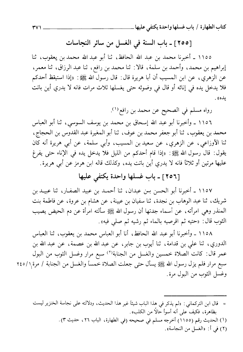 1155 - أَخْبَرَنَا مُحَمَّدُ بْنُ عَبْدِ اللهِ الْحَافِظُ، ثنا أَبُو عَبْدِ اللهِ مُحَمَّدُ بْنُ يَعْقُوبَ، ثنا إِبْرَاهِيمُ بْنُ مُحَمَّدٍ، وَأَحْمَدُ بْنُ سَلَمَةَ، قَالَا: ثنا مُحَمَّدُ بْنُ رَافِعٍ، ثنا عَبْدُ الرَّزَّاقِ، ثنا مَعْمَرٌ، عَنِ الزُّهْرِيِّ، عَنِ ابْنِ الْمُسَيِّبِ، أَنَّ أَبَا هُرَيْرَةَ، قَالَ: قَالَ رَسُولُ اللهِ صَلَّى اللهُ عَلَيْهِ وَسَلَّمَ: §" إِذَا اسْتَيْقَظَ أَحَدُكُمْ فَلَا يُدْخِلْ يَدَهُ فِي إِنَائِهِ - أَوْ قَالَ: فِي وَضُوئِهِ - حَتَّى يَغْسِلَهَا ثَلَاثَ مَرَّاتٍ فَإِنَّهُ لَا يَدْرِي أَيْنَ بَاتَتْ يَدُهُ " رَوَاهُ مُسْلِمٌ فِي الصَّحِيحِ عَنْ مُحَمَّدِ بْنِ رَافِعٍ