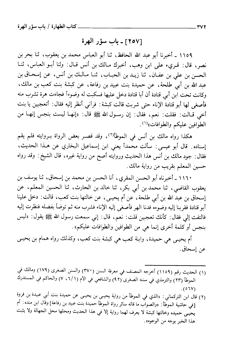 1159 - أَخْبَرَنَا أَبُو عَبْدِ اللهِ الْحَافِظُ، ثنا أَبُو الْعَبَّاسِ مُحَمَّدُ بْنُ يَعْقُوبَ، ثنا بَحْرُ بْنُ نَصْرٍ، قَالَ: قُرِئَ عَلَى ابْنِ وَهْبٍ: أَخْبَرَكَ مَالِكُ بْنُ أَنَسٍ، قَالَ: وَثنا أَبُو الْعَبَّاسِ، ثنا الْحَسَنُ بْنُ عَلِيِّ بْنِ عَفَّانَ، ثنا زَيْدُ بْنُ الْحُبَابِ، ثنا مَالِكُ بْنُ أَنَسٍ، عَنْ إِسْحَاقَ بْنِ عَبْدِ اللهِ بْنِ أَبِي طَلْحَةَ، عَنْ حُمَيْدَةَ بِنْتِ عُبَيْدِ بْنِ رِفَاعَةَ، عَنْ كَبْشَةَ بِنْتِ كَعْبِ بْنِ مَالِكٍ، وَكَانَتْ تَحْتَ ابْنِ أَبِي قَتَادَةَ أَنَّ أَبَا قَتَادَةَ دَخَلَ عَلَيْهَا فَسَكَبَتْ لَهُ وَضُوءًا فَجَاءَتْ هِرَّةٌ تَشْرَبُ مِنْهُ فَأَصْغَى لَهَا أَبُو قَتَادَةَ الْإِنَاءَ حَتَّى شَرِبَتْ قَالَتْ كَبْشَةُ: فَرَآنِي أَنْظُرُ إِلَيْهِ فَقَالَ: " أَتَعْجَبِينَ يَا بِنْتَ أَخِي قَالَتْ: فَقُلْتُ: نَعَمْ فَقَالَ: إِنَّ رَسُولَ اللهِ صَلَّى اللهُ عَلَيْهِ وَسَلَّمَ، قَالَ: §" إِنَّهَا لَيْسَتْ بِنَجَسٍ إِنَّهَا مِنَ الطَّوَّافِينَ عَلَيْكُمْ وَالطَّوَّافَاتِ " هَكَذَا رَوَاهُ مَالِكُ بْنُ أَنَسٍ فِي الْمُوَطَّأِ وَقَدْ قَصَّرَ بَعْضُ الرُّوَاةِ بِرِوَايَتِهِ فَلَمْ يُقِمْ إِسْنَادَهُ قَالَ أَبُو عِيسَى سَأَلْتُ مُحَمَّدًا يَعْنِي ابْنَ إِسْمَاعِيلَ الْبُخَارِيَّ عَنْ هَذَا الْحَدِيثِ فَقَالَ: جَوَّدَ مَالِكُ بْنُ أَنَسٍ هَذَا الْحَدِيثَ وَرِوَايَتُهُ أَصَحُّ مِنْ رِوَايَةِ غَيْرِهِ، قَالَ الشَّيْخُ: وَقَدْ رَوَاهُ حُسَيْنٌ الْمُعَلِّمُ بِقَرِيبٍ مِنْ رِوَايَةِ مَالِكٍ