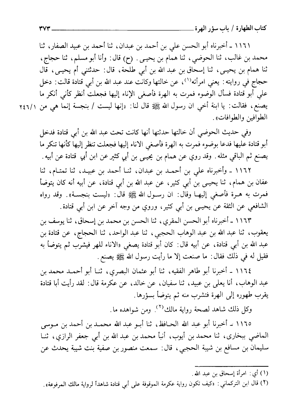 1161 - أَخْبَرَنَاهُ أَبُو الْحَسَنِ عَلِيُّ بْنُ أَحْمَدَ بْنِ عَبْدَانَ، ثنا أَحْمَدُ بْنُ عُبَيْدٍ الصَّفَّارُ، ثنا مُحَمَّدُ بْنُ غَالِبٍ، ثنا الْحَوْضِيُّ، ثنا هَمَّامُ بْنُ يَحْيَى، ح. قَالَ: وَأنا أَبُو مُسْلِمٍ، ثنا حَجَّاجٌ، ثنا هَمَّامُ بْنُ يَحْيَى، ثنا إِسْحَاقُ بْنُ عَبْدِ اللهِ بْنِ أَبِي طَلْحَةَ، قَالَ: حَدَّثَتْنِي أُمُّ يَحْيَى - قَالَ حَجَّاجٌ فِي رِوَايَتِهِ: يَعْنِي امْرَأَتَهُ - عَنْ خَالَتِهَا وَكَانَتْ عِنْدَ عَبْدِ اللهِ بْنِ أَبِي قَتَادَةَ قَالَتْ: دَخَلَ عَلَيَّ أَبُو قَتَادَةَ فَسَأَلَ الْوَضُوءَ فَمَرَّتْ بِهِ الْهِرَّةُ فَأَصْغَى الْإِنَاءَ إِلَيْهَا فَجَعَلْتُ أَنْظُرُ كَأَنِّي أُنْكِرُ مَا يَصْنَعُ فَقَالَتْ: يَا ابْنَةَ أَخِي إِنَّ رَسُولَ اللهِ صَلَّى اللهُ عَلَيْهِ وَسَلَّمَ، قَالَ لَنَا: §" إِنَّهَا لَيْسَتْ بِنَجِسَةٍ إِنَّمَا هِيَ مِنَ الطَّوَّافِينَ وَالطَّوَّافَاتِ " وَفِي حَدِيثِ الْحَوْضِيِّ أَنَّ خَالَتَهَا حَدَّثَتْهَا أَنَّهَا كَانَتْ تَحْتَ عَبْدِ اللهِ بْنِ أَبِي قَتَادَةَ فَدَخَلَ أَبُو قَتَادَةَ عَلَيْهَا فَدَعَا بِوَضُوءٍ فَمَرَّتْ بِهِ الْهِرَّةُ فَأَصْغَى الْإِنَاءَ إِلَيْهَا فَجَعَلَتْ تَنْظُرُ إِلَيْهَا كَأَنَّهَا تُنْكِرُ مَا يَصْنَعُ، ثُمَّ الْبَاقِي مِثْلَهُ وَقَدْ رُوِيَ عَنْ هَمَّامِ بْنِ يَحْيَى بْنِ أَبِي كَثِيرٍ، عَنِ ابْنِ أَبِي قَتَادَةَ، عَنْ أَبِيهِ