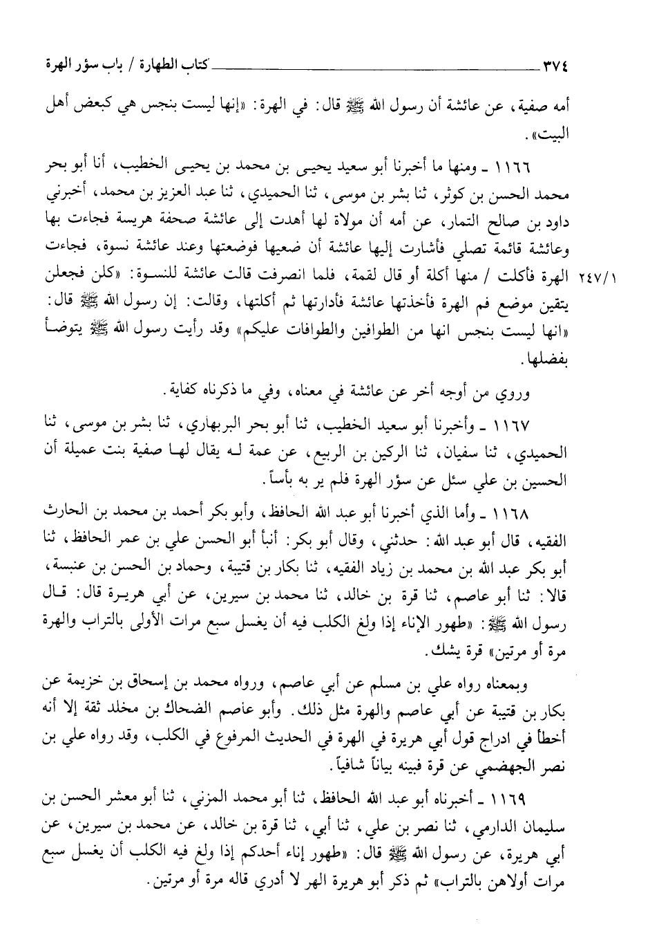 1166 - وَمِنْهَا مَا أَخْبَرَنَا أَبُو سَعِيدٍ يَحْيَى بْنُ مُحَمَّدِ بْنِ يَحْيَى الْخَطِيبُ أنا أَبُو بَحْرٍ مُحَمَّدُ الْحَسَنُ بْنُ كَوْثَرٍ، ثنا بِشْرُ بْنُ مُوسَى، ثنا الْحُمَيْدِيُّ، ثنا عَبْدُ الْعَزِيزِ بْنُ مُحَمَّدٍ، أَخْبَرَنِي دَاوُدُ بْنُ صَالِحٍ التَّمَّارُ، عَنْ أُمِّهِ، أَنَّ مَوْلَاةً لَهَا أَهْدَتْ إِلَى عَائِشَةَ صَحْفَةَ هَرِيسَةٍ فَجَاءَتْ بِهَا وَعَائِشَةُ قَائِمَةٌ تُصَلِّي فَأَشَارَتْ إِلَيْهَا عَائِشَةُ أَنْ ضَعِيهَا فَوَضَعَتْهَا وَعِنْدَ عَائِشَةَ نِسْوَةٌ فَجَاءَتِ الْهِرَّةُ فَأَكَلَتْ مِنْهَا أَكْلَةً - أَوْ قَالَ لُقْمَةً - فَلَمَّا انْصَرَفَتْ قَالَتْ عَائِشَةُ لِلنِّسْوَةِ: كُلْنَ فَجَعَلْنَ يَتَّقِينَ مَوْضِعَ فَمِ الْهِرَّةِ فَأَخَذَتْهَا عَائِشَةُ فَأَدَارَتْهَا، ثُمَّ أَكَلَتْهَا وَقَالَتْ إِنَّ رَسُولَ اللهِ صَلَّى اللهُ عَلَيْهِ وَسَلَّمَ، قَالَ: " §إِنَّهَا لَيْسَتْ بِنَجَسٍ إِنَّهَا مِنَ الطَّوَّافِينَ وَالطَّوَّافَاتِ عَلَيْكُمْ " وَقَدْ رَأَيْتُ رَسُولَ اللهِ صَلَّى اللهُ عَلَيْهِ وَسَلَّمَ يَتَوَضَّأُ بِفَضْلِهَا وَرُوِيَ مِنْ أَوْجُهٍ أُخَرَ عَنْ عَائِشَةَ فِي مَعْنَاهُ وَفِي مَا ذَكَرْنَاهُ كِفَايَةٌ