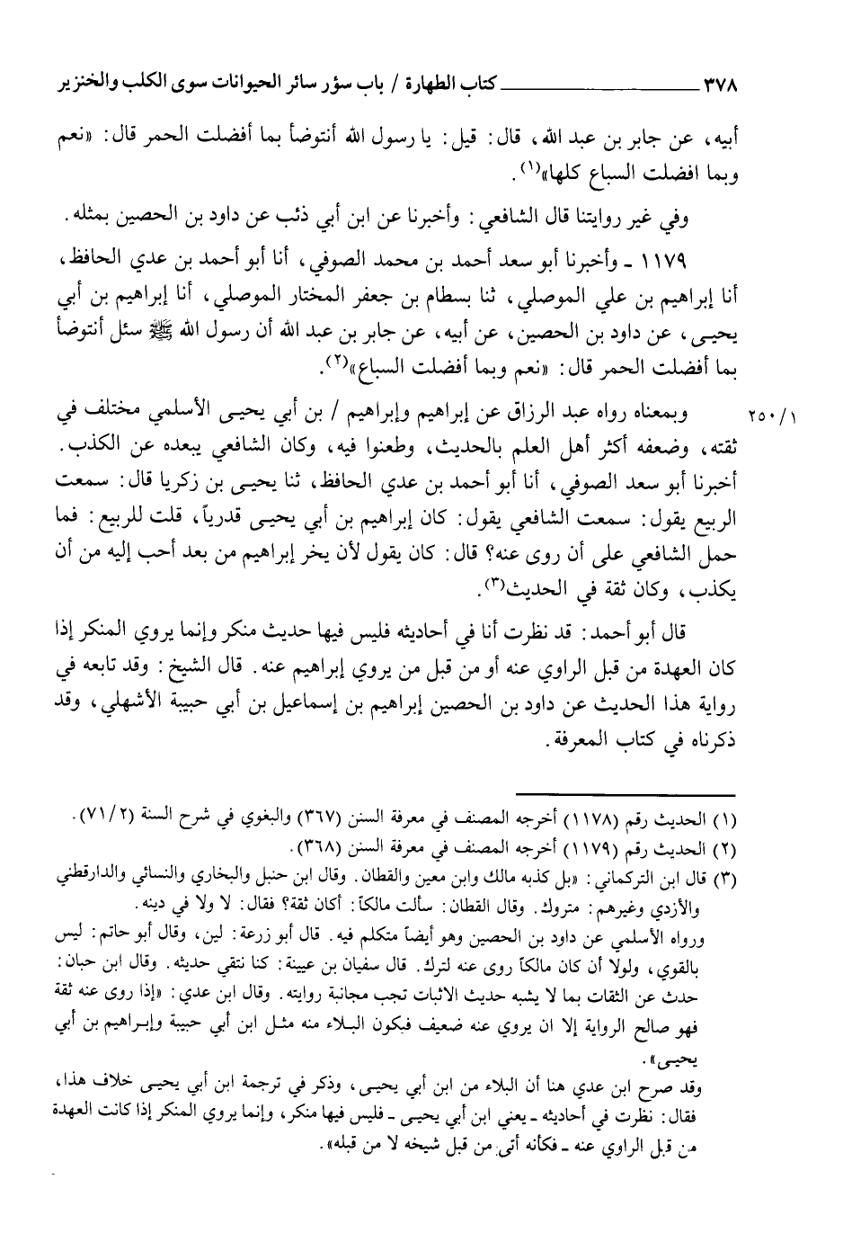 1179 - وَأَخْبَرَنَا أَبُو سَعْدٍ أَحْمَدُ بْنُ مُحَمَّدٍ الصُّوفِيُّ أنا أَبُو أَحْمَدَ بْنُ عَدِيٍّ الْحَافِظُ، أنا إِبْرَاهِيمُ بْنُ عَلِيٍّ الْمَوْصِلِيُّ، ثنا بِسْطَامُ بْنُ جَعْفَرٍ الْمُخْتَارُ الْمَوْصِلِيُّ، أنا إِبْرَاهِيمُ بْنُ أَبِي يَحْيَى، عَنْ دَاوُدَ بْنِ الْحُصَيْنِ، عَنْ أَبِيهِ، عَنْ جَابِرِ بْنِ عَبْدِ اللهِ، أَنَّ رَسُولَ اللهِ صَلَّى اللهُ عَلَيْهِ وَسَلَّمَ سُئِلَ: §أَنَتَوَضَّأُ بِمَا أَفْضَلَتِ الْحُمُرُ؟ قَالَ: " نَعَمْ وَبِمَا أَفْضَلَتِ السِّبَاعُ " وَبِمَعْنَاهُ رَوَاهُ عَبْدُ الرَّزَّاقِ، عَنْ إِبْرَاهِيمَ وَإِبْرَاهِيمُ بْنُ أَبِي يَحْيَى الْأَسْلَمِيُّ مُخْتَلَفٌ فِي ثِقَتِهِ وَضَعَّفَهُ أَكْثَرُ أَهْلِ الْعِلْمِ بِالْحَدِيثِ وَطَعَنُوا فِيهِ وَكَانَ الشَّافِعِيُّ يُبْعِدُهُ عَنِ الْكَذِبِ أَخْبَرَنَا أَبُو سَعْدٍ الصُّوفِيُّ أَنَا أَبُو أَحْمَدَ بْنُ عَدِيٍّ الْحَافِظُ، ثنا يَحْيَى بْنُ زَكَرِيَّا، قَالَ: سَمِعْتُ الرَّبِيعَ يَقُولُ: سَمِعْتُ الشَّافِعِيَّ يَقُولُ: كَانَ إِبْرَاهِيمُ بْنُ أَبِي يَحْيَى قَدَرِيًّا قُلْتُ لِلرَّبِيعِ: فَمَا حَمَلَ الشَّافِعِيَّ عَلَى أَنْ رَوَى عَنْهُ؟ قَالَ: كَانَ يَقُولُ لَأَنْ يَخِرَّ إِبْرَاهِيمُ مِنْ بُعْدٍ أَحَبُّ إِلَيْهِ مِنْ أَنْ يَكْذِبَ وَكَانَ ثِقَةً فِي الْحَدِيثِ قَالَ أَبُو أَحْمَدَ: قَدْ نَظَرْتُ أَنَا فِي أَحَادِيثِهِ فَلَيْسَ فِيهَا حَدِيثٌ مُنْكَرٌ وَإِنَّمَا يَرْوِي الْمُنْكَرَ إِذَا كَانَ الْعُهْدَةُ مِنْ قِبَلِ الرَّاوِي عَنْهُ أَوْ مِنْ قِبْلِ مَنْ يَرْوِي إِبْرَاهِيمُ عَنْهُ قَالَ الشَّيْخُ: وَقَدْ تَابَعَهُ فِي رِوَايَةِ هَذَا الْحَدِيثِ عَنْ دَاوُدَ بْنِ الْحُصَيْنِ إِبْرَاهِيمُ بْنُ إِسْمَاعِيلَ بْنِ أَبِي حَبِيبَةَ الْأَشْهَلِيُّ وَقَدْ ذَكَرْنَاهُ فِي كِتَابِ الْمَعْرِفَةِ