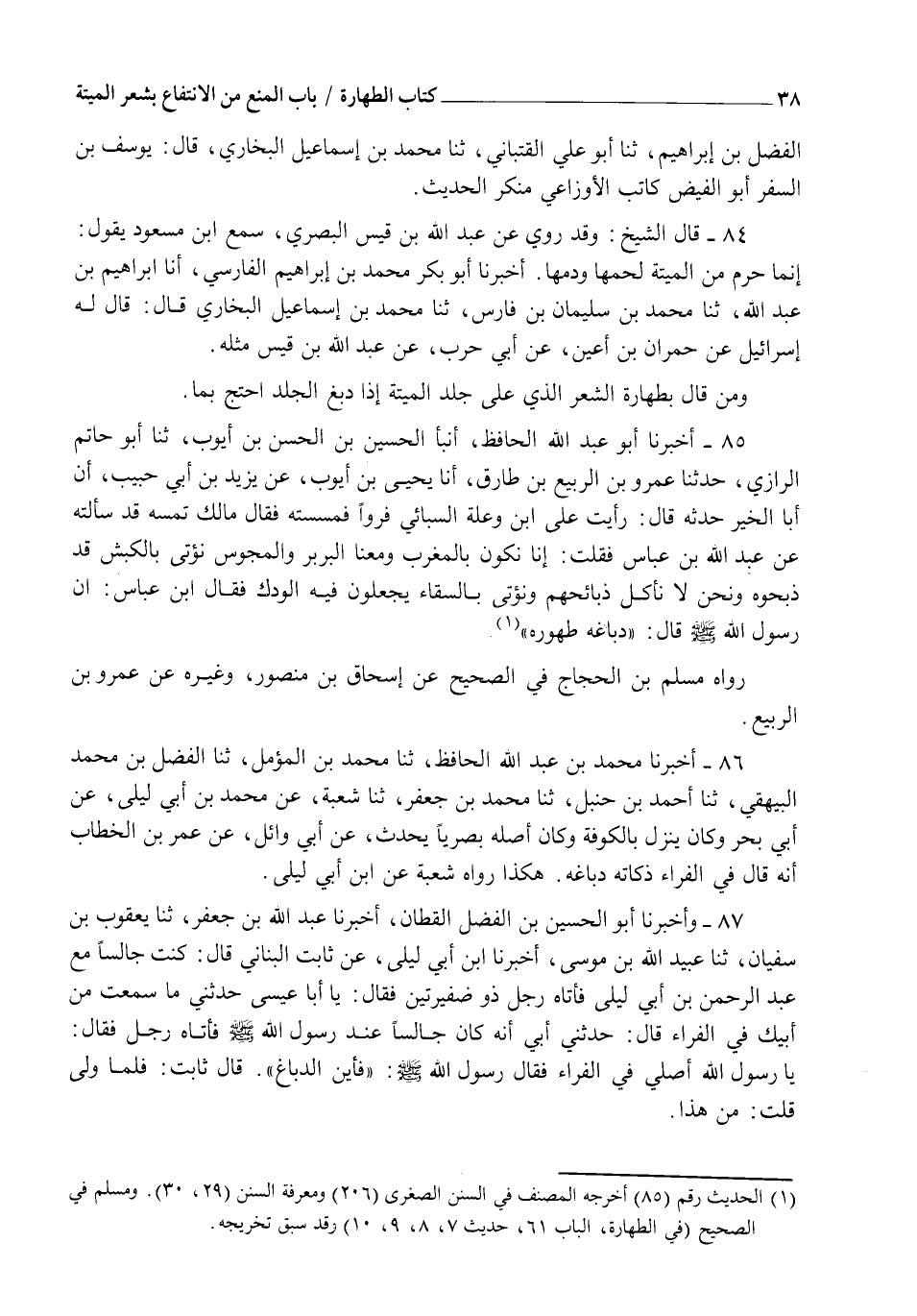 85 - أَخْبَرَنَا أَبُو عَبْدِ اللهِ الْحَافِظُ، أنبأ الْحُسَيْنُ بْنُ الْحَسَنِ بْنِ أَيُّوبَ، ثنا أَبُو حَاتِمٍ الرَّازِيُّ، حَدَّثَنَا عَمْرُو بْنُ الرَّبِيعِ بْنِ طَارِقٍ، أنا يَحْيَى بْنُ أَيُّوبَ، عَنْ يَزِيدَ بْنِ أَبِي حَبِيبٍ، أَنَّ أَبَا الْخَيْرِ، حَدَّثَهُ قَالَ: رَأَيْتُ عَلَى ابْنِ وَعْلَةَ السَّبَائِيَّ فَرْوًا فَمَسَسْتُهُ، فَقَالَ: مَا لَكَ تَمَسُّهُ؟ قَدْ سَأَلْتُهُ، عَنْ عَبْدِ اللهِ بْنِ عَبَّاسٍ، فَقُلْتُ: إِنَا نَكُونُ بِالْمَغْرِبِ وَمَعَنْا الْبَرْبَرُ وَالْمَجُوسُ نُؤْتَى بِالْكَبْشِ قَدْ ذَبَحُوهُ، وَنَحْنُ لَا نَأْكُلُ ذَبَائِحَهُمْ وَنُؤتَى بِالسِّقَاءِ يَجْعَلُونَ فِيهِ الْوَدَكَ، فَقَالَ ابْنُ عَبَّاسٍ: إِنَّ رَسُولَ اللهِ صَلَّى اللهُ عَلَيْهِ وَسَلَّمَ، قَالَ: §" دِبَاغُهُ طَهُورُهُ ". رَوَاهُ مُسْلِمُ بْنُ الْحَجَّاجِ فِي الصَّحِيحِ، عَنْ إِسْحَاقَ بْنِ مَنْصُورٍ، وَغَيْرِهِ، عَنْ عَمْرِو بْنِ الرَّبِيعِ