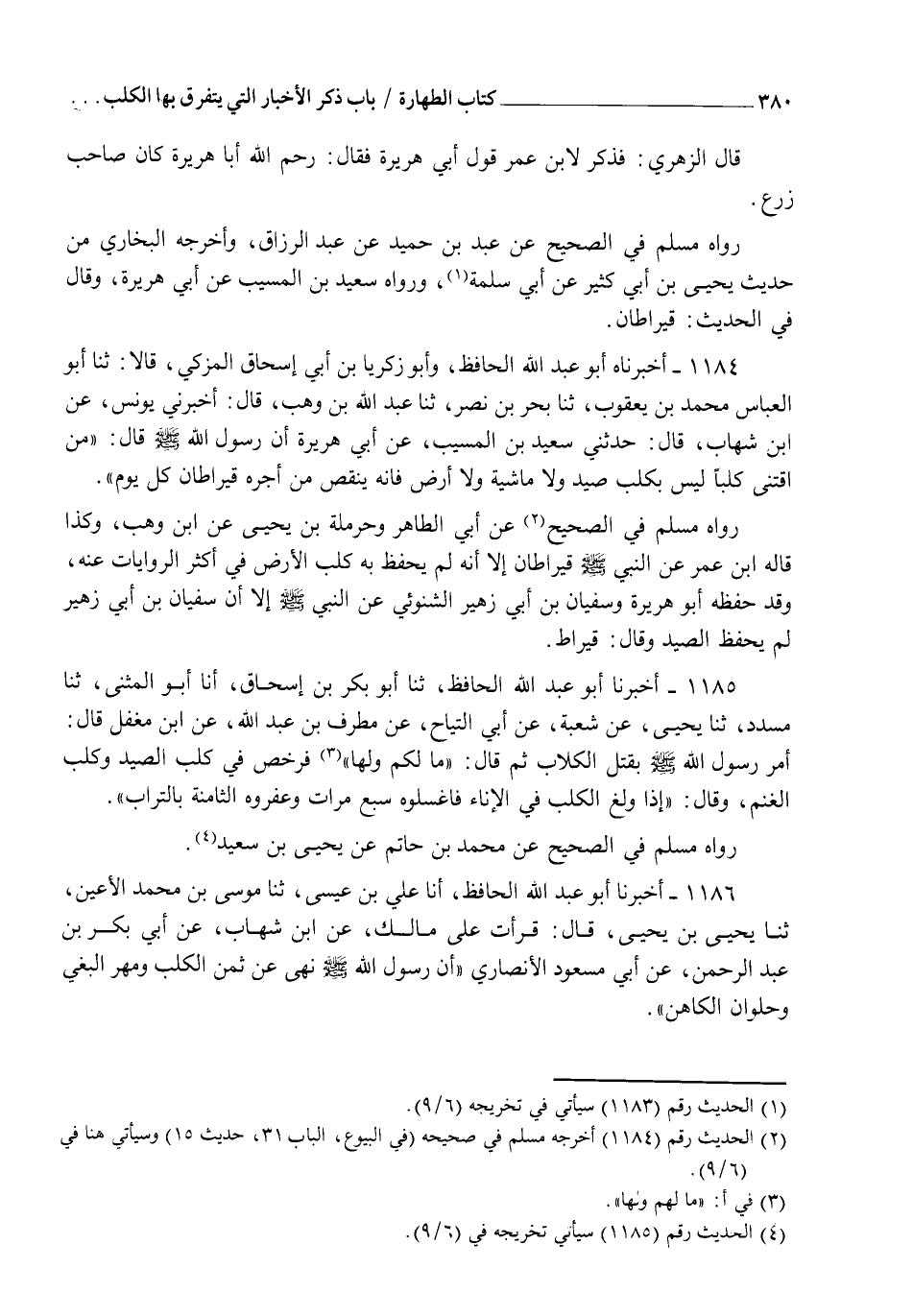 1184 - أَخْبَرَنَاهُ أَبُو عَبْدِ اللهِ الْحَافِظُ، وَأَبُو زَكَرِيَّا بْنُ أَبِي إِسْحَاقَ الْمُزَكِّي قَالَا: ثنا أَبُو الْعَبَّاسِ مُحَمَّدُ بْنُ يَعْقُوبَ، ثنا بَحْرُ بْنُ نَصْرٍ، ثنا عَبْدُ اللهِ بْنُ وَهْبٍ، قَالَ: أَخْبَرَنِي يُونُسُ، عَنِ ابْنِ شِهَابٍ، قَالَ: حَدَّثَنِي سَعِيدُ بْنُ الْمُسَيِّبِ، عَنْ أَبِي هُرَيْرَةَ، أَنَّ رَسُولَ اللهِ صَلَّى اللهُ عَلَيْهِ وَسَلَّمَ، قَالَ: §" مَنِ اقْتَنَى كَلْبًا لَيْسَ بِكَلْبِ صَيْدٍ وَلَا مَاشِيَةٍ وَلَا أَرْضٍ فَإِنَّهُ يَنْقُصُ مِنْ أَجْرِهِ قِيرَاطَانِ كُلَّ يَوْمٍ " رَوَاهُ مُسْلِمٌ فِي الصَّحِيحِ عَنْ أَبِي الطَّاهِرِ وَحَرْمَلَةَ بْنِ يَحْيَى، عَنِ ابْنِ وَهْبٍ وَكَذَا قَالَهُ ابْنُ عُمَرَ، عَنِ النَّبِيِّ صَلَّى اللهُ عَلَيْهِ وَسَلَّمَ: قِيرَاطَانِ إِلَّا أَنَّهُ لَمْ يَحْفَظْ فِيهِ كَلْبَ الْأَرْضِ فِي أَكْثَرِ الرِّوَايَاتِ عَنْهُ، وَقَدْ حِفْظَهُ أَبُو هُرَيْرَةَ وَسُفْيَانُ بْنُ أَبِي زُهَيْرٍ الشَّنُوئِيُّ، عَنِ النَّبِيِّ صَلَّى اللهُ عَلَيْهِ وَسَلَّمَ إِلَّا أَنَّ سُفْيَانَ بْنَ أَبِي زُهَيْرٍ لَمْ يَحْفَظِ الصَّيْدَ وَقَالَ: قِيرَاطٌ