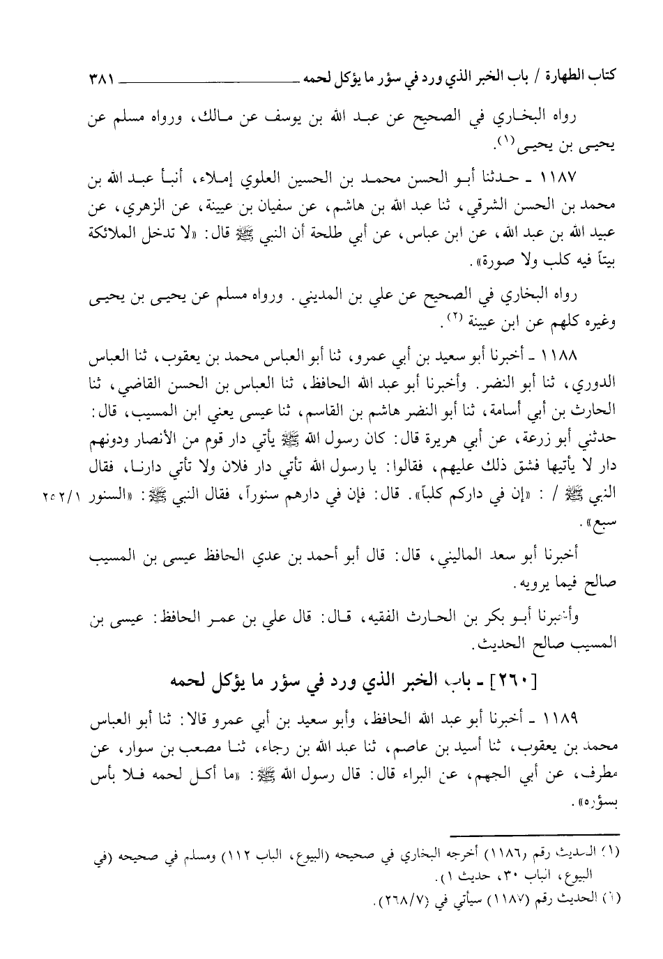 1188 - أَخْبَرَنَا أَبُو سَعِيدِ بْنُ أَبِي عَمْرٍو، ثنا أَبُو الْعَبَّاسِ مُحَمَّدُ بْنُ يَعْقُوبَ، ثنا الْعَبَّاسُ الدُّورِيُّ، ثنا أَبُو النَّضْرِ، وَأَخْبَرَنَا أَبُو عَبْدِ اللهِ الْحَافِظُ، ثنا الْعَبَّاسُ بْنُ الْحَسَنِ الْقَاضِي، ثنا الْحَارِثُ بْنُ أَبِي أُسَامَةَ، ثنا أَبُو النَّضْرِ هَاشِمُ بْنُ الْقَاسِمِ، ثنا عِيسَى يَعْنِي ابْنَ الْمُسَيِّبِ، قَالَ: حَدَّثَنِي أَبُو زُرْعَةَ، عَنْ أَبِي هُرَيْرَةَ، قَالَ: كَانَ رَسُولُ اللهِ صَلَّى اللهُ عَلَيْهِ وَسَلَّمَ يَأْتِي دَارَ قَوْمٍ مِنَ الْأَنْصَارِ وَدُونَهُمْ دَارٌ لَا يَأْتِيهَا فَشَقَّ ذَلِكَ عَلَيْهِمْ فَقَالُوا: يَا رَسُولَ اللهِ تَأْتِي دَارَ فُلَانٍ وَلَا تَأْتِي دَارَنَا؟ فَقَالَ النَّبِيُّ صَلَّى اللهُ عَلَيْهِ وَسَلَّمَ: " إِنَّ فِي دَارِكُمْ كَلْبًا " قَالَ: فَإِنَّ فِي دَارِهِمْ سِنَّوْرًا فَقَالَ النَّبِيُّ صَلَّى اللهُ عَلَيْهِ وَسَلَّمَ: " §السِّنَّوْرُ سَبُعٌ " أَخْبَرَنَا أَبُو سَعْدٍ الْمَالِينِيُّ، قَالَ: قَالَ أَبُو أَحْمَدَ بْنُ عَدِيٍّ الْحَافِظُ: عِيسَى بْنُ الْمُسَيِّبِ صَالِحٌ فِيمَا يَرْوِيهِ وَأَخْبَرَنَا أَبُو بَكْرِ بْنُ الْحَارِثِ الْفَقِيهُ، قَالَ: قَالَ عَلِيُّ بْنُ عُمَرَ الْحَافِظُ: عِيسَى بْنُ الْمُسَيِّبِ صَالِحُ الْحَدِيثِ